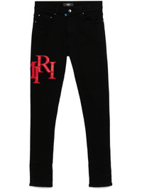 Staggered-logo-embroidered jeans Highlights - Black - Button fly fastening - Belt loops - Classic five pockets - Logo patch to the rear Made in United States Composition Sheepskin 100%, Cotton 92%, Elastomultiester 6%, Elastane 2% SIZE & FIT Model measurements Height 6 ft 2 in(1.88 m) Bust/Chest 35.43 in(90 cm) Hips 35.03 in(89 cm) Waist 27.95 in(71 cm) FittingInformation Designed for a skinny fit, these jeans offer a close fit throughout Sturdy and hard-wearing, this denim piece offers no stretch