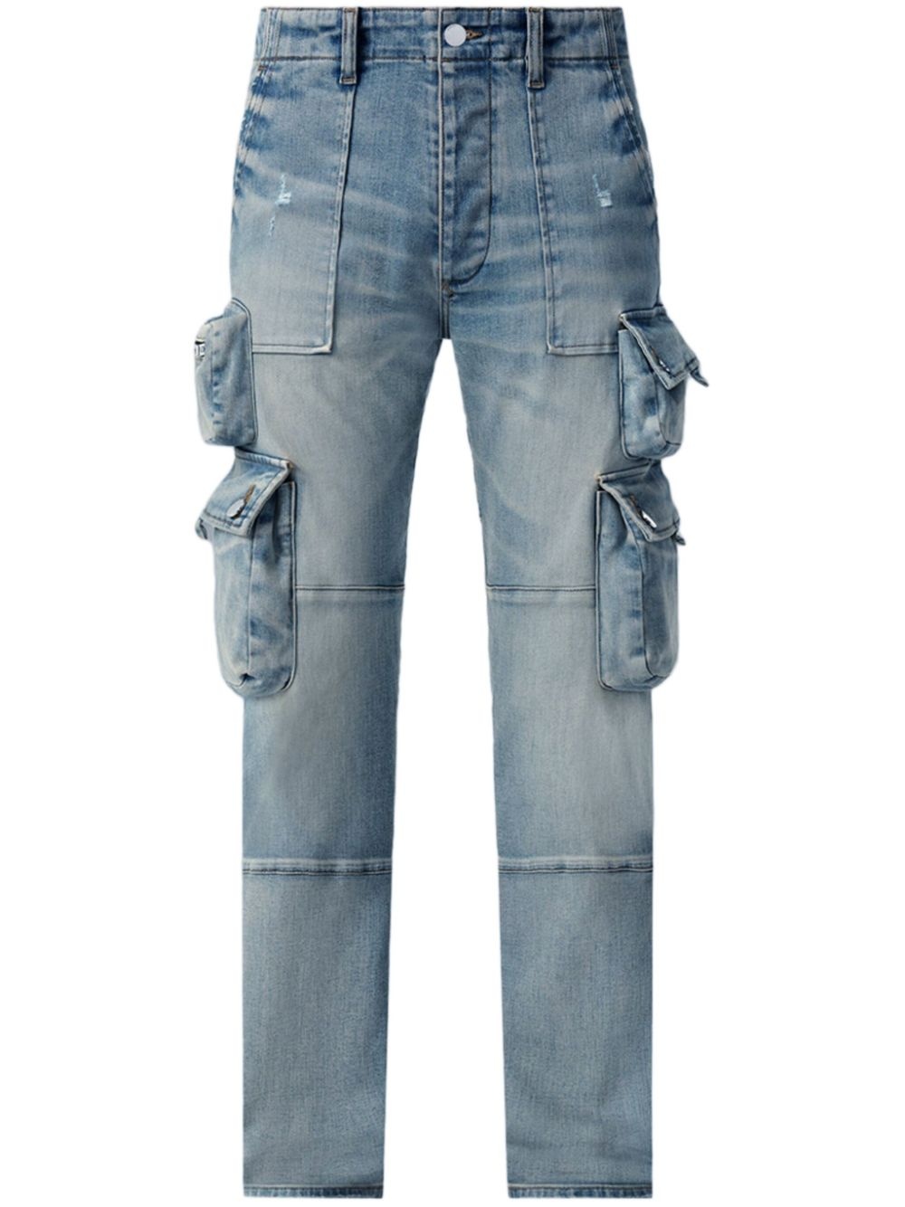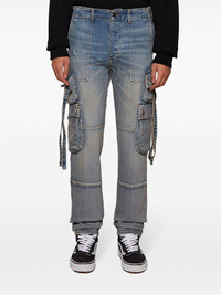 Tactical cargo jeans Highlights - Light blue - Stretch-cotton - Denim - Distressed effect - Concealed fly and button fastening - Belt loops - Two side slash pockets - Multiple cargo pockets - Logo patch to the rear - Two rear flap pockets - Straight leg Made in United States Composition Cotton 92%, Elastomultiester 6%, Elastane 2%