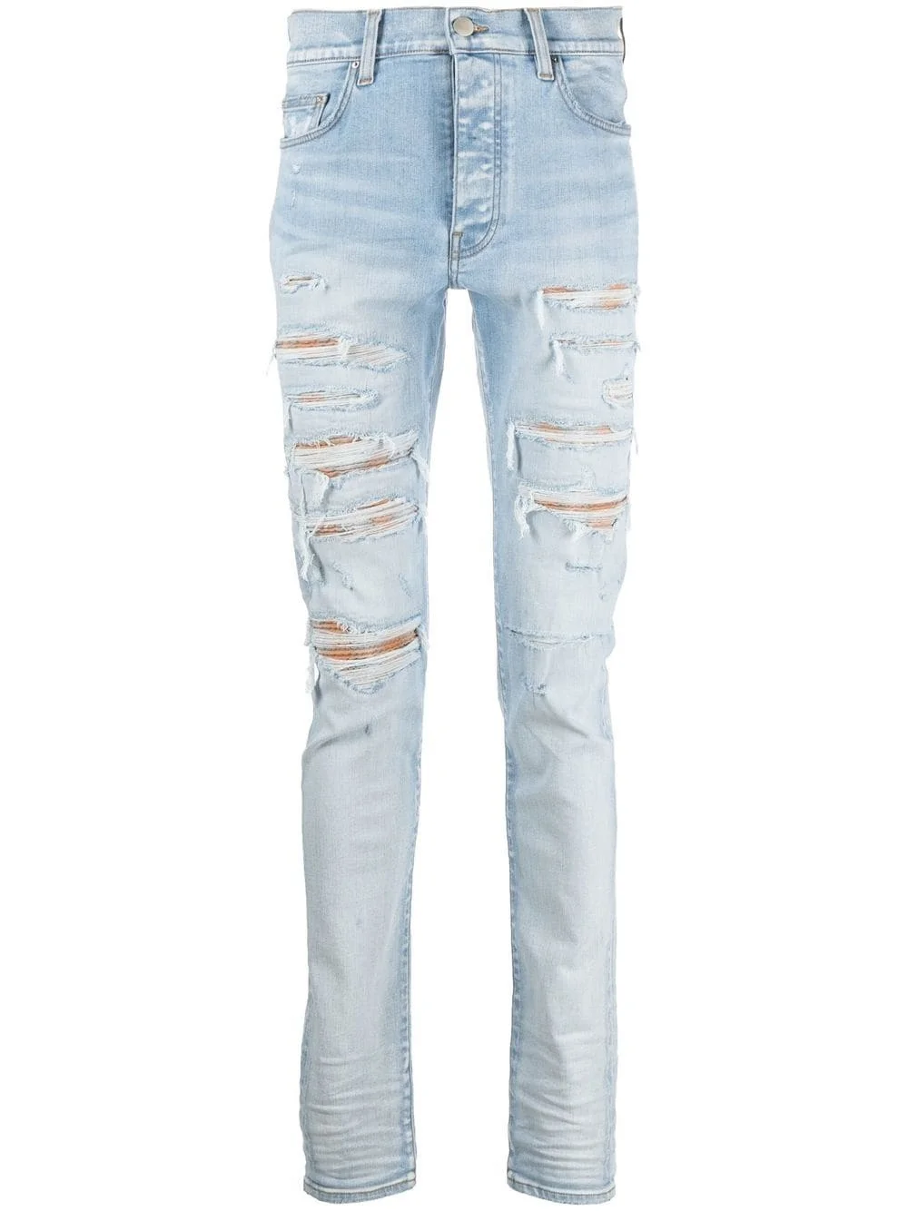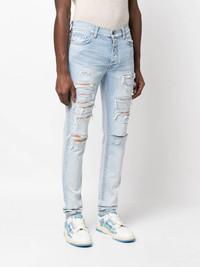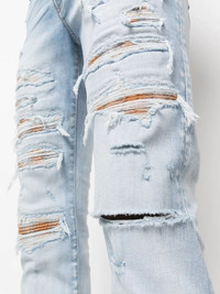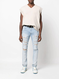 Thrasher distressed skinny jeans blue stretch-cotton distressed finish whiskering effect mid-rise concealed front fastening classic five pockets slim cut Made in United States Composition Cotton 92%, Polyester 6%, Elastane 2% SIZE & FIT Measurement FRONT RISE 10.51 in(26.7 cm) INSIDE LEG 34.48 in(87.6 cm) BACK RISE 12.99 in(33 cm) HIPS 34.01 in(86.4 cm) Hem Width 10.98 in(27.9 cm) WAIST 30 in(76.2 cm) Washing instructions Dry Clean Only