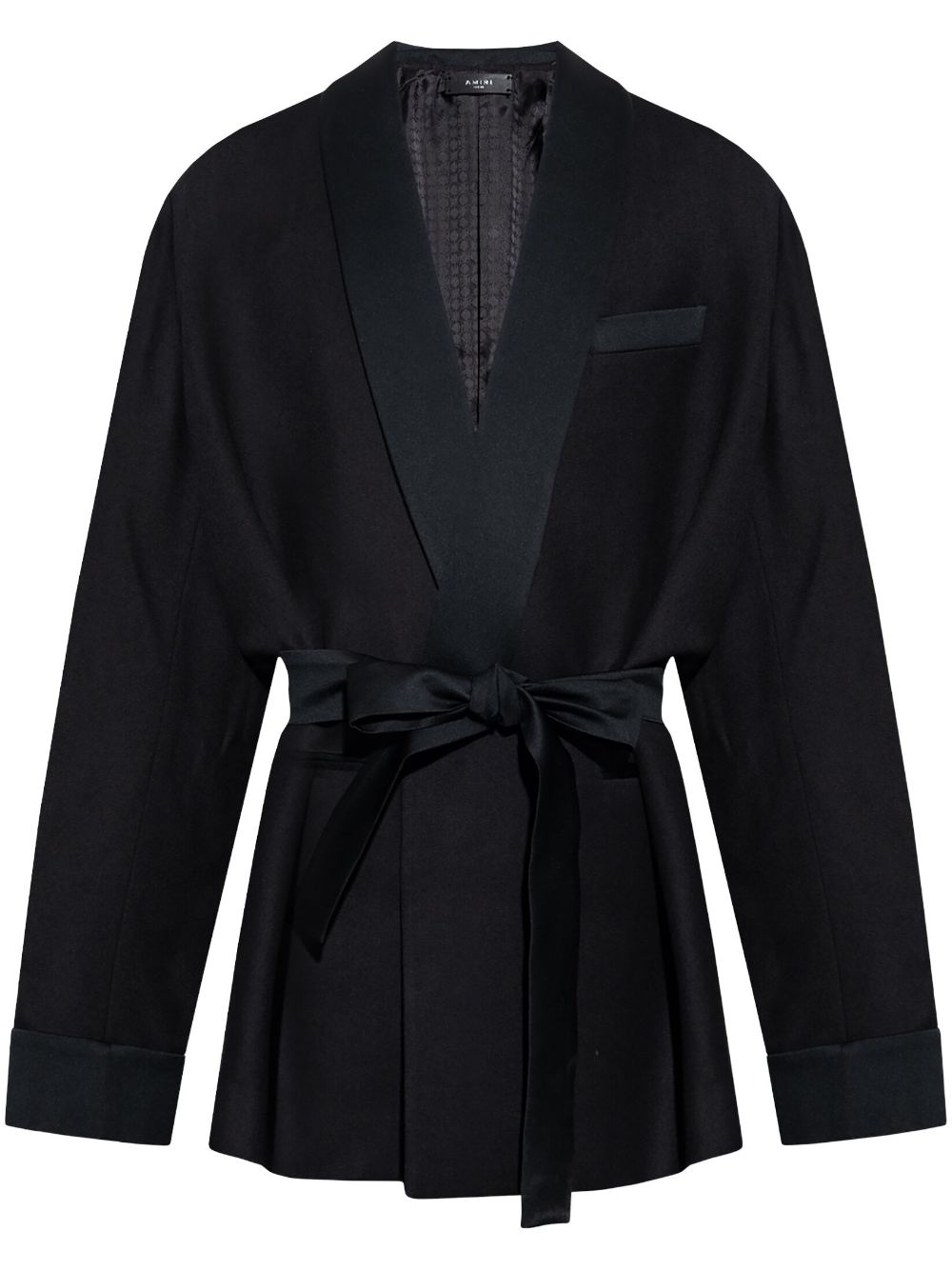 tie-waist blazer Highlights - Black - Wool blend - Self-tie fastening belted waist - Shawl lapels - Drop shoulder - Chest welt pocket - Long sleeves - Contrasting cuffs - Slip pockets to the sides - Logo patch to the rear - Straight hem Made in Italy Composition Wool 63%, Viscose 37%