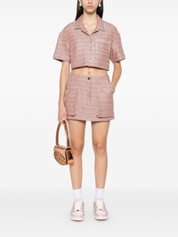 tweed mini skirt Highlights - Flamingo pink - Tweed - Lurex detailing - Front button and zip fastening - Belt loops - Two front jetted pockets - Two side inset pockets - Silver-tone logo plaque to the rear - Two rear jetted pockets - Straight hem - Thigh-length - Satin lining Made in Italy Composition Outer: Cotton 40%, Polyester 37%, Acrylic 13%, Polyamide 10% Lining: Viscose 100% SIZE & FIT Model measurements Height 5 ft 10 in(1.78 m) Bust/Chest 33.85 in(86 cm) Hips 36.61 in(93 cm) Waist 26.77 in(68 cm) FittingInformation This mini-length skirt is intended to be worn just below the waist Made from a midweight non-stretch fabric