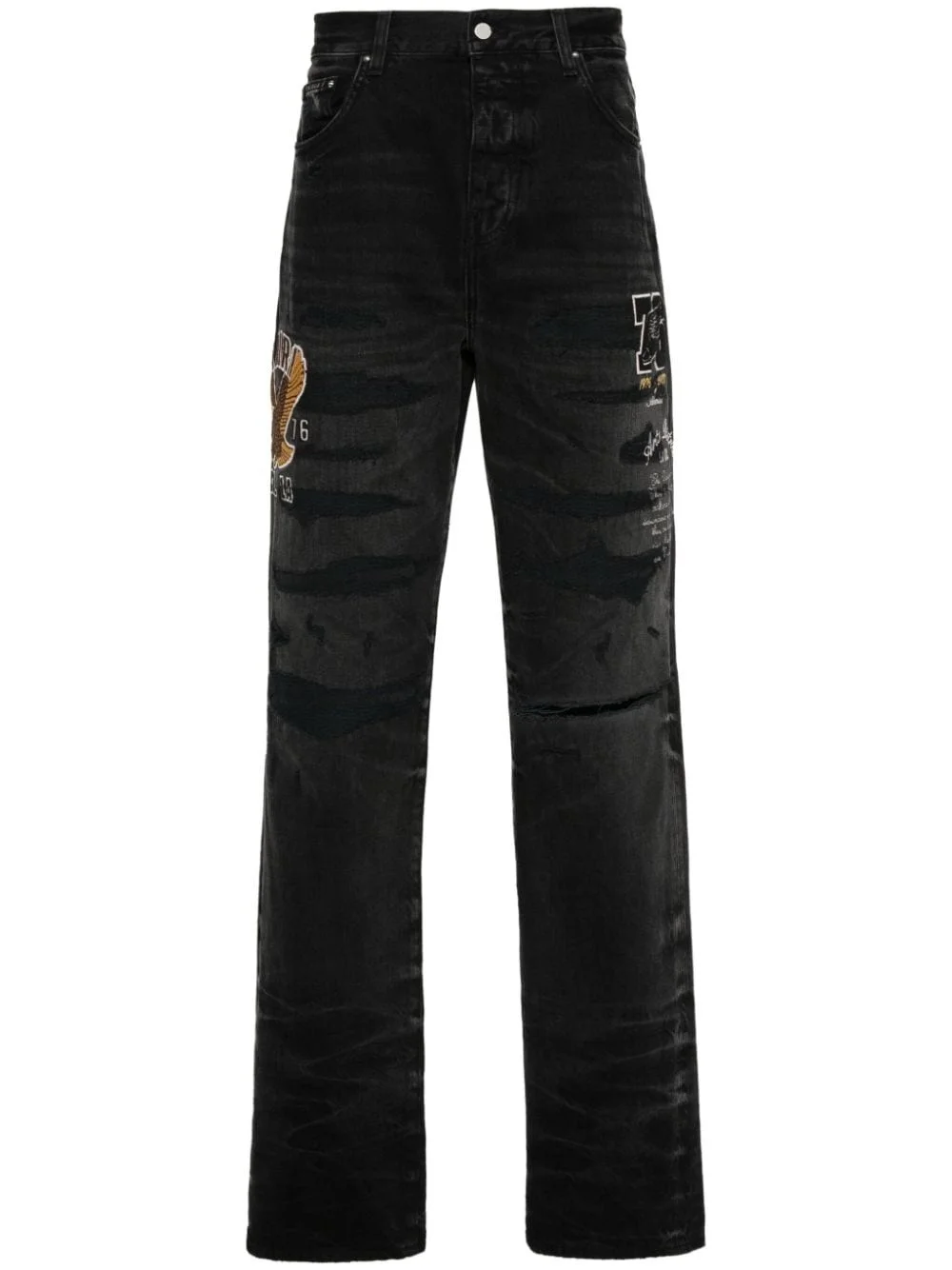 Varsity straigh-leg jeans AMIRI's black Varsity jeans take their name from the collegiate-inspired appliques at the leg that nod to the brand’s Americana roots. They’re cut from rigid denim to a straight-leg profile then shredded and faded for a well-worn finish. Highlights - Black - Denim - Faded effect - Ripped detailing - Mid-rise - Belt loops - Embroidered slogan - Patch detail - Classic five pockets - Logo patch to the rear - Raw-cut edge - Straight leg - Button fly fastening Made in United States Composition Cotton 100% SIZE & FIT Model measurements Height 6 ft 1 in(1.86 m) Bust/Chest 37.4 in(95 cm) Hips 36.22 in(92 cm) Waist 29.52 in(75 cm) FittingInformation Designed with a straight leg, these jeans allow for an unrestricted and comfortable fit over the leg Sturdy and hard-wearing, this denim piece offers no stretch This piece fits true to size – take your usual size Washing instructions Dry Clean Only