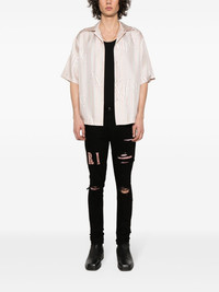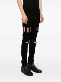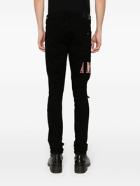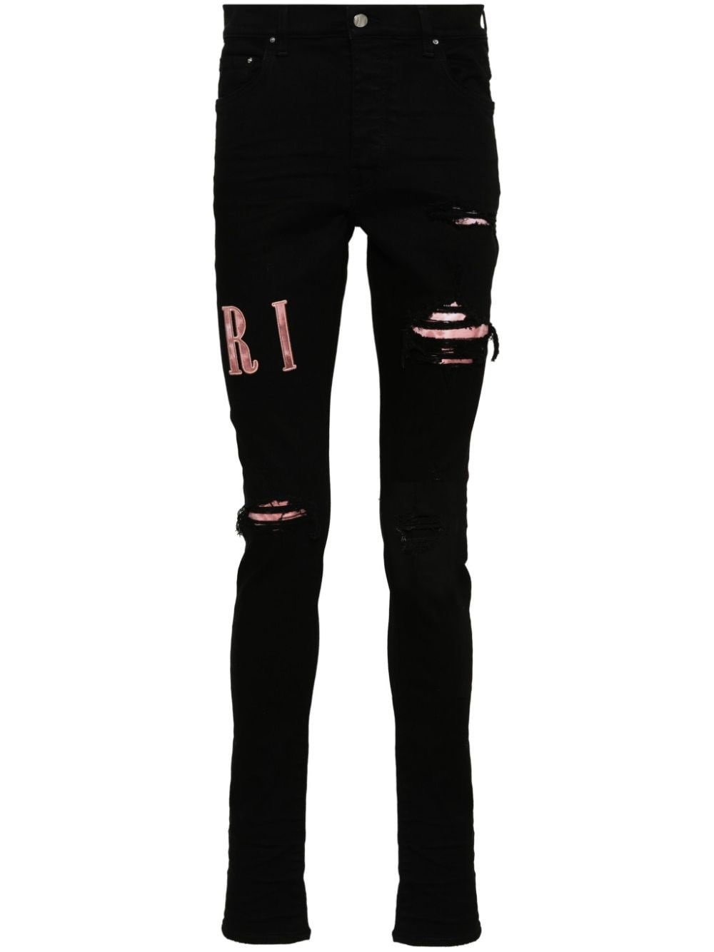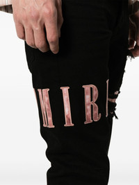 waxed logo-applique skinny jeans The tie-dye logo that wraps around the leg of these AMIRI jeans matches the panels beneath the hand-shredded holes. They’re cut from black stretch denim to maintain the skinny silhouette and coated with wax for a subtle shine. Highlights - Black/light pink - Stretch-cotton - Waxed denim - Applique logo - Ripped detailing - Contrasting panel detail - Button fly fastening - Mid-rise - Belt loops - Classic five pockets - Silver-tone logo plaque - Skinny cut Made in United States Composition Cotton 92%, Elastomultiester 6%, Elastane 2% SIZE & FIT Model measurements Height 6 ft 2 in(1.87 m) Bust/Chest 36.61 in(93 cm) Hips 35.03 in(89 cm) Waist 27.95 in(71 cm) FittingInformation Designed for a skinny fit, these jeans offer a close fit throughout Constructed from stretch denim, this piece offers a stretch fit with durability This piece fits true to size – take your usual size Measurement FRONT RISE 10 in(25.4 cm) INSIDE LEG 34.01 in(86.4 cm) BACK RISE 12 in(30.5 cm) HIPS 35.98 in(91.4 cm) Hem Width 12 in(30.5 cm) WAIST 32 in(81.3 cm) Washing instructions Dry Clean Only
