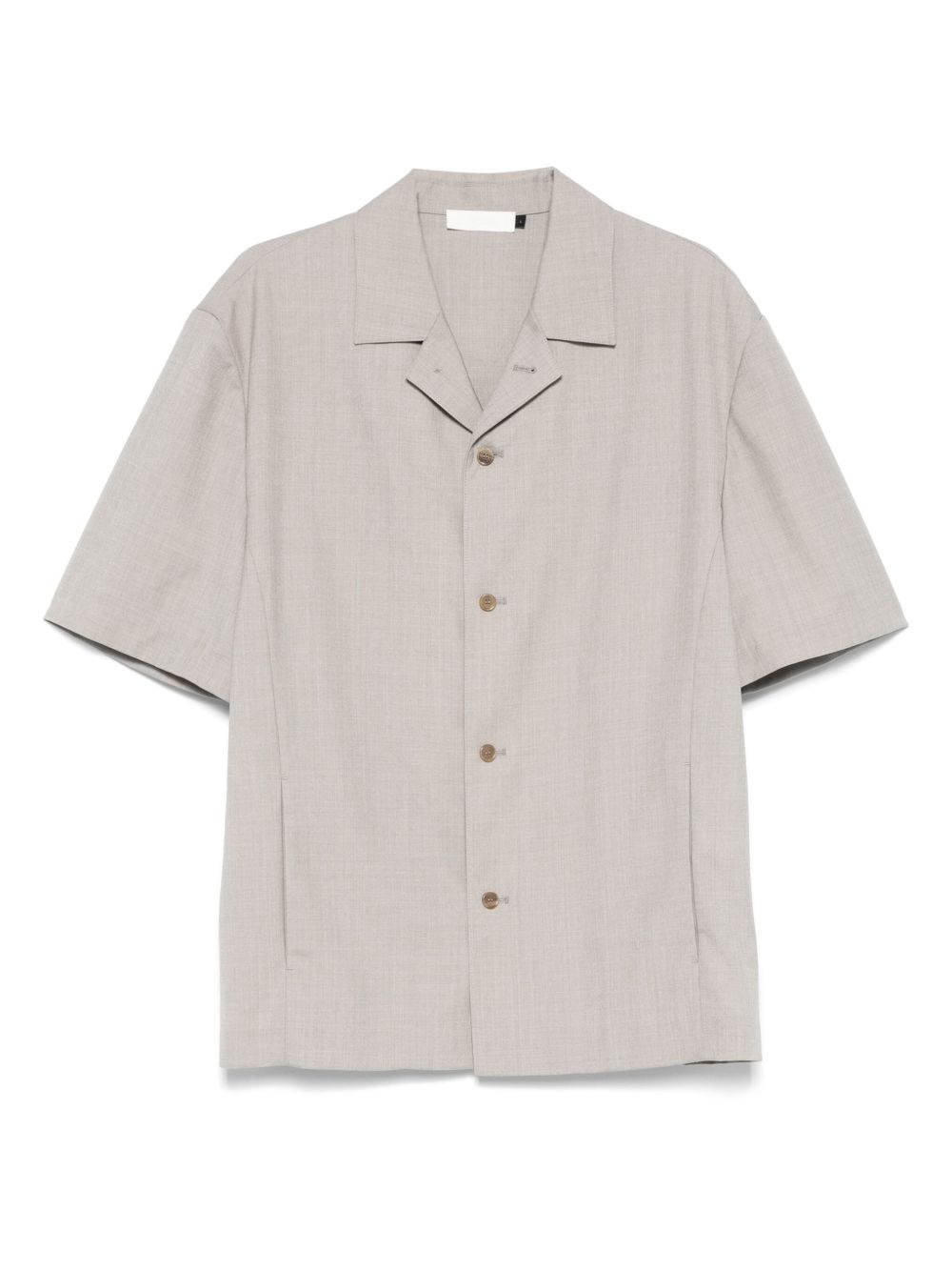 button-down shirt Highlights - Beige - Front button fastening - Two side slit pockets - Camp collar - Short sleeves Imported Composition Wool 50%, Polyester 50% SIZE & FIT Model measurements Height 6 ft 2 in(1.88 m) Bust/Chest 36.61 in(93 cm) Hips 35.82 in(91 cm) Waist 27.95 in(71 cm) FittingInformation Designed to be unstructured, offering a loose fit throughout Made from a midweight non-stretch fabric Washing instructions Dry Clean Only