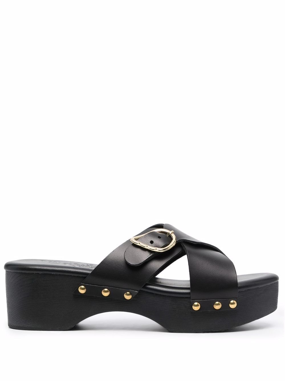 Marilia clog sandals black leather crossover strap at the toe side buckle fastening open toe gold-tone stud detailing open toe Imported Composition Leather 100% SIZE & FIT Measurement HEEL 1.96 in(5 cm) PLATFORM 1.18 in(3 cm)