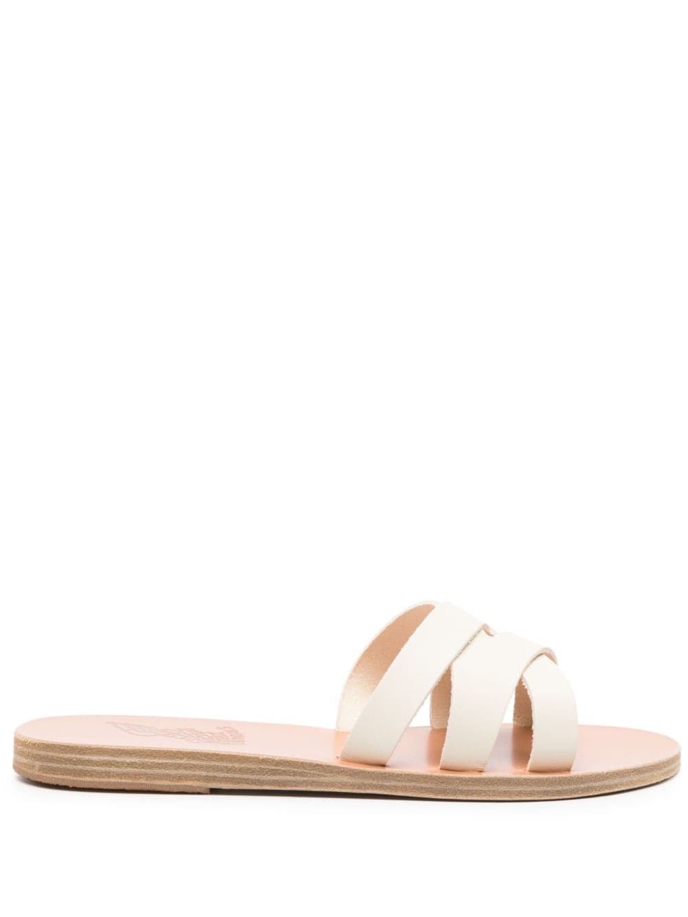 slip-on leather sandals Highlights - Off-white - Calf leather - Smooth grain - Multi-way strap design - Slip-on style - Round open toe - Branded leather insole - Leather and rubber sole Imported Composition Sole: Rubber 100%, Calf Leather 100% Lining: Calf Leather 100% Outer: Calf Leather 100% SIZE & FIT Measurement HEEL 0.59 in(1.5 cm)