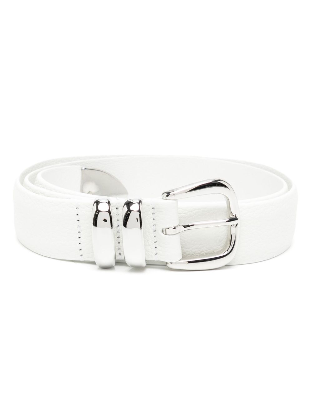 leather belt Highlights - White - Calf leather - Grained texture - Front buckle fastening - Silver-tone hardware Made in Italy Composition Calf Leather 100% SIZE & FIT Measurement Maximum Length 37 in(94 cm) Minimum Length 33.07 in(84 cm) TOTAL LENGTH 41.33 in(105 cm) WIDTH 1.25 in(3.2 cm)