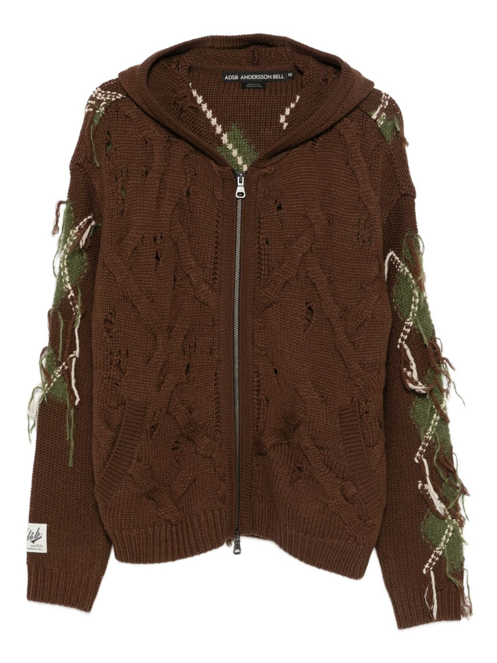cable-knit fringed hoodie Highlights - Brown - Cable knit - Fringed detailing on sleeves - Classic hood - Front zip fastening Imported Composition Acrylic 52%, Wool 48% SIZE & FIT Model measurements Height 6 ft 2 in(1.88 m) Bust/Chest 36.61 in(93 cm) Hips 35.82 in(91 cm) Waist 27.95 in(71 cm) Washing instructions Read Manufacturer Guidelines