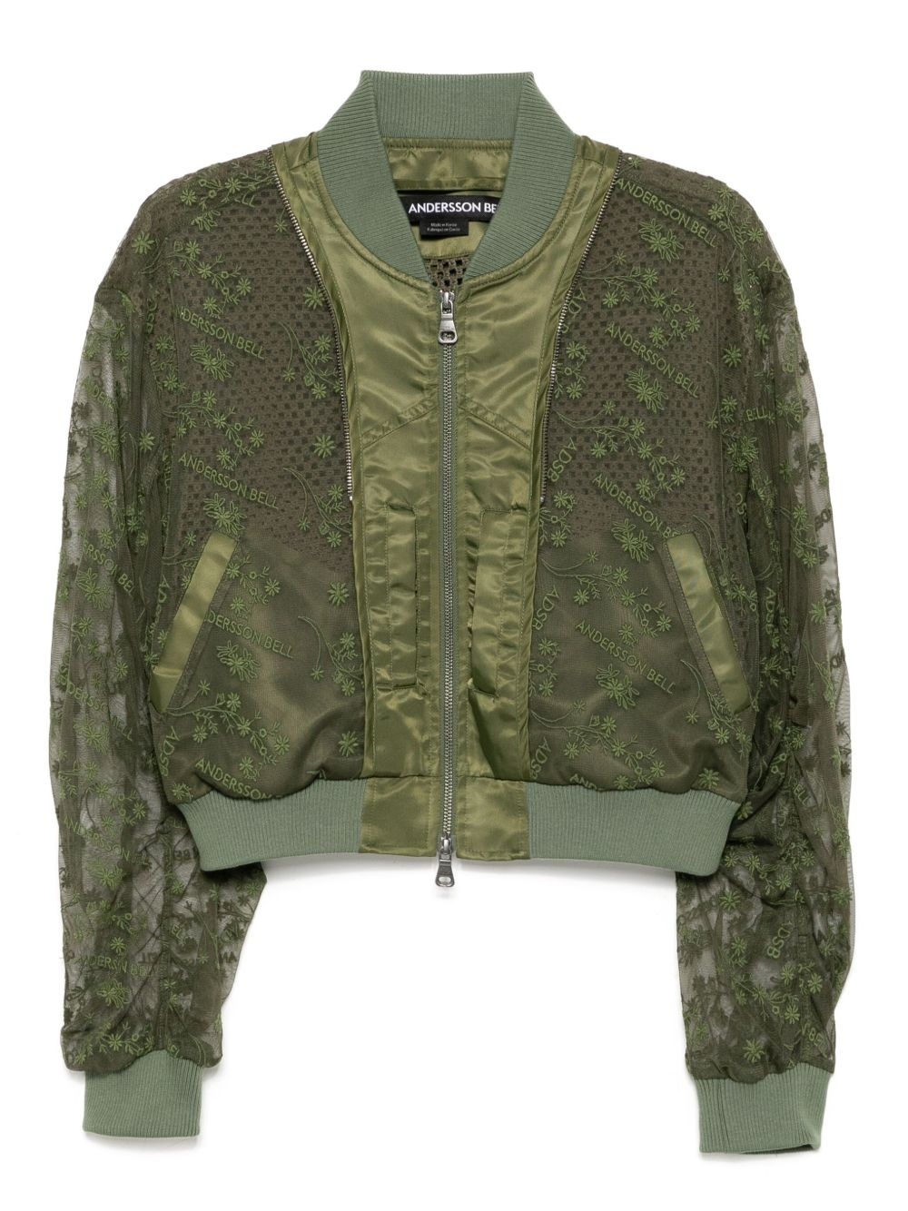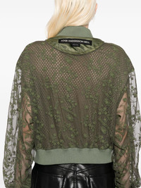 double layered logo lace short bomber jacket Highlights - Olive green - Front zip fastening - Baseball collar - Two side welt pockets - Semi-sheer construction Imported Composition Lining: Polyester 68%, Cotton 32% Outer: Nylon 100% SIZE & FIT Model measurements Height 5 ft 9 in(1.76 m) Bust/Chest 31.1 in(79 cm) Hips 35.03 in(89 cm) Waist 24.4 in(62 cm) FittingInformation Designed to be unstructured, offering a loose fit throughout Made from a midweight non-stretch fabric