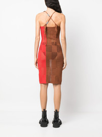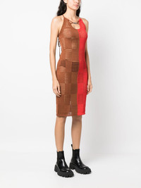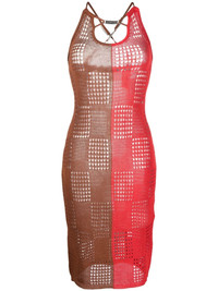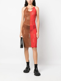 two-tone open-knit dress crimson/chocolate brown open knit stretch-design two-tone design cut-out detailing halterneck tie fastening silver-tone logo plaque ribbed hem Imported Composition Linen/Flax 45%, Acrylic 35%, Nylon 20% SIZE & FIT Model measurements Height 5 ft 10 in(1.79 m) Bust/Chest 33.07 in(84 cm) Hips 35.82 in(91 cm) Waist 24.01 in(61 cm)