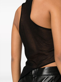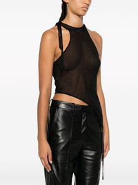 asymmetric sheer tank top Highlights - Black - Modal blend - Sheer - Strap detailing - Round neck - Side tie fastening at the neck - Racerback - Asymmetric hem Made in Italy Composition Modal 71%, Polyamide 16%, Silk 13% SIZE & FIT Model measurements Height 5 ft 10 in(1.77 m) Bust/Chest 31.88 in(81 cm) Hips 36.22 in(92 cm) Waist 24.01 in(61 cm) FittingInformation Designed for a close fit throughout Made from a lightweight non-stretch fabric, this piece offers minimal elasticity when worn This piece fits true to size – take your usual size Washing instructions Hand Wash