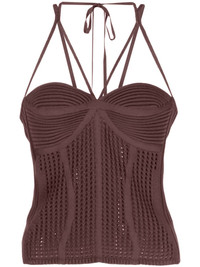 halterneck knitted top Highlights - Brown - Knitted construction - Ribbed panelling - Halterneck tie fastening - Spaghetti straps - Sweetheart neck - Square open back - Straight hem Made in Italy Composition Body: Viscose 80%, Polyester 10%, Polyamide 9%, Elastane 1% SIZE & FIT Model measurements Height 5 ft 10 in(1.77 m) Bust/Chest 31.88 in(81 cm) Hips 33.85 in(86 cm) Waist 24.01 in(61 cm) FittingInformation Designed for a close fit throughout Made with a midweight knit, this piece offers some stretch This piece fits true to size – take your usual size Washing instructions Hand Wash