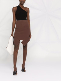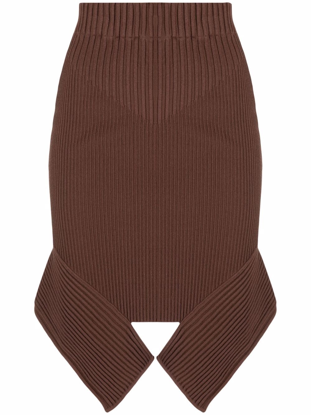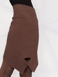 rib-knit asymmetric skirt nude brown ribbed knit asymmetric hem Made in Italy Composition Viscose 80%, Polyester 10%, Polyamide 9%, Spandex/Elastane 1% SIZE & FIT Model measurements Height 5 ft 11 in(1.8 m) Bust/Chest 32.67 in(83 cm) Hips 36.22 in(92 cm) Waist 24.4 in(62 cm) FittingInformation This piece fits true to size. We recommend you get your regular size Cut for a slim fit Made with a mid-weight stretch fabric Washing instructions Machine Wash