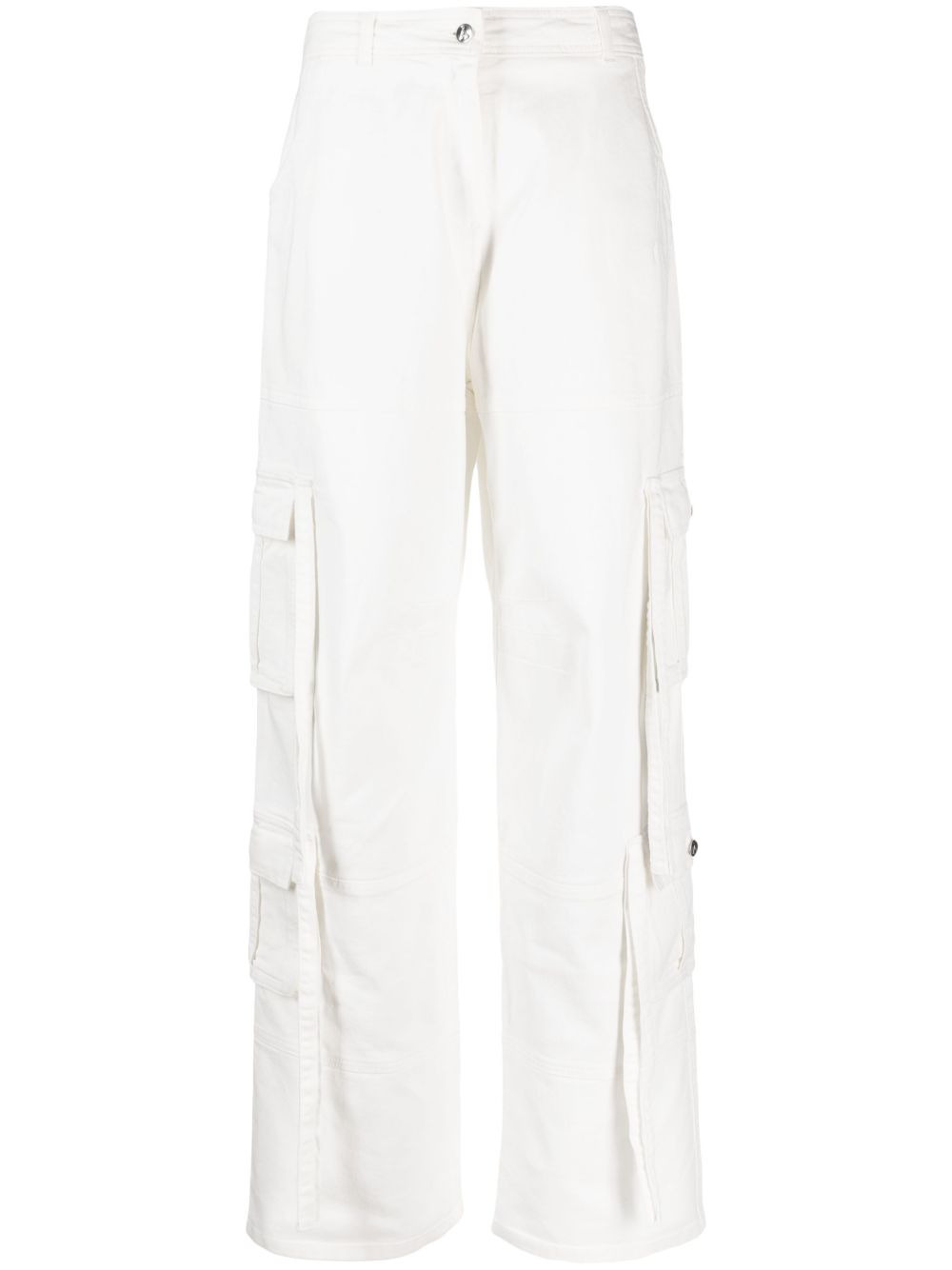 wide-leg cargo trousers Highlights - Ivory white - Stretch-cotton - High waist - Belt loops - Front button and zip fastening - Two side slash pockets - Two rear patch pockets - Multiple cargo pockets - Wide leg Made in Italy Composition Cotton 97%, Spandex/Elastane 3% SIZE & FIT Model measurements Height 5 ft 11 in(1.8 m) Bust/Chest 31.49 in(80 cm) Hips 35.43 in(90 cm) Waist 24.4 in(62 cm) FittingInformation Designed for a straight-leg fit, these trousers allow for a close fit at the waist and an unrestricted, comfortable fit over the leg Constructed from stretch denim, this piece offers a stretch fit with durability This piece fits true to size – take your usual size Washing instructions Machine Wash
