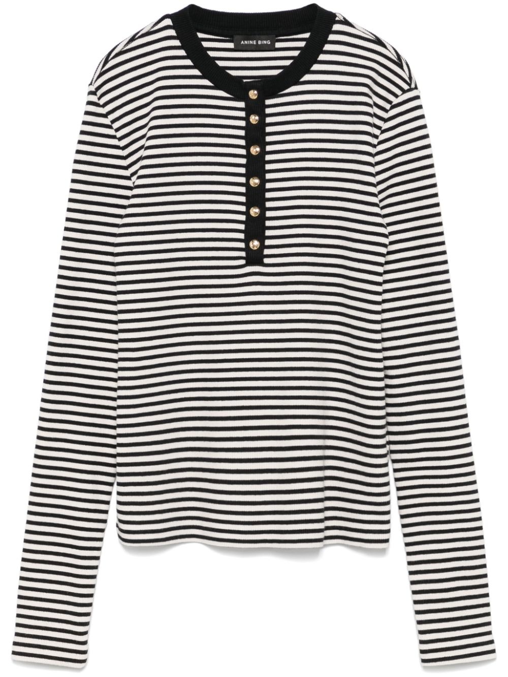 Alessia T-shirt Highlights - Black/white - Cotton blend - Stretch-design - Fine ribbed - Short front press-stud fastening - Horizontal stripe pattern - Solid border - Crew neck - Long sleeves - Ribbed hem Imported Composition Cotton 95%, Elastane 5% SIZE & FIT Model measurements Height 5 ft 11 in(1.8 m) Bust/Chest 33.07 in(84 cm) Hips 37.4 in(95 cm) Waist 25.19 in(64 cm) FittingInformation Designed for a slim fit that sits just away from the body offering a close yet comfortable fit Made from a midweight stretch fabric, this piece offers elasticity and flexibility when worn