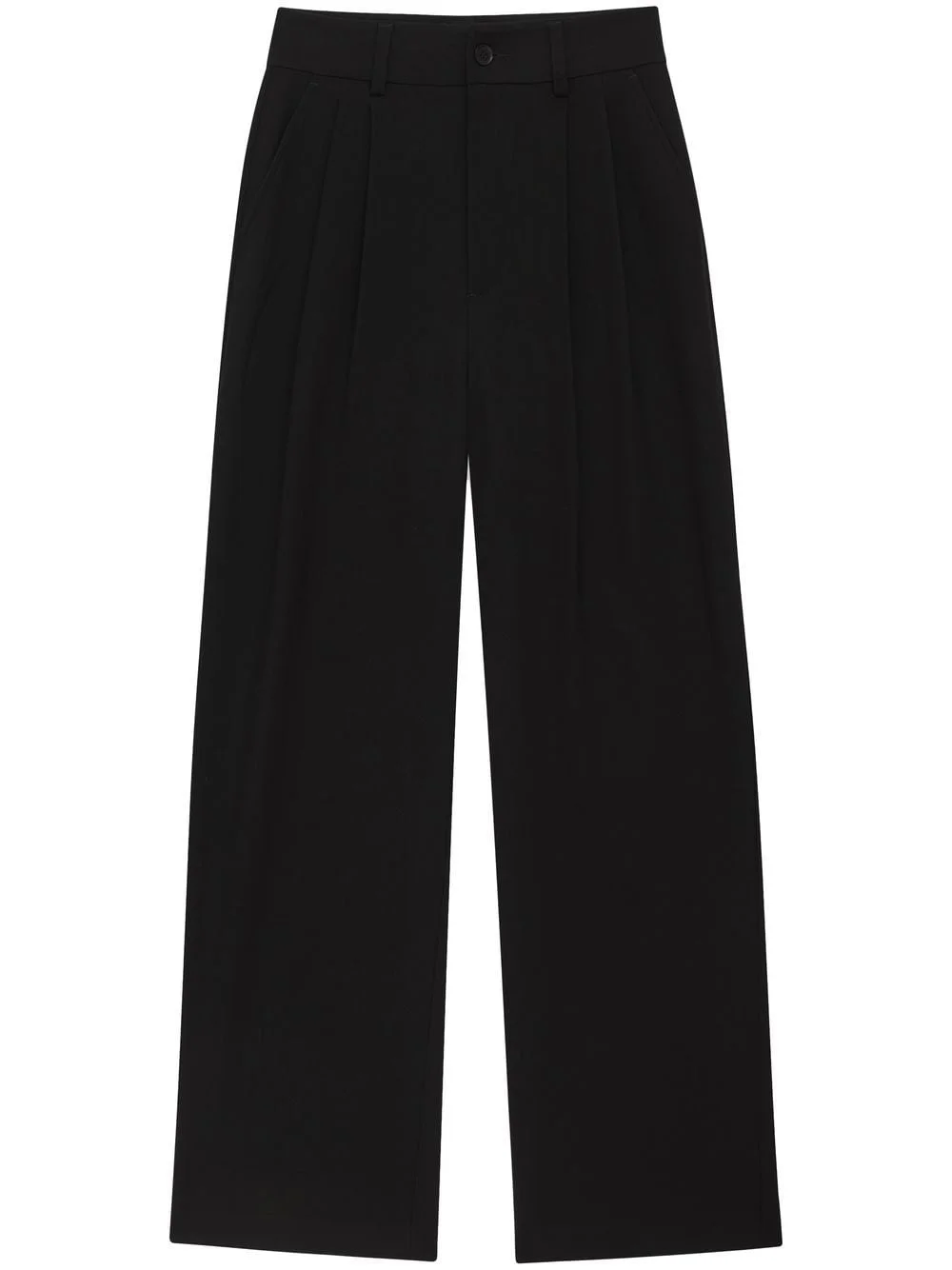 Carrie wide-leg twill pants black twill weave pleat detailing high-waisted belt loops front button and zip fastening two side slash pockets wide leg Imported Composition Viscose 86%, Virgin Wool 11%, Elastane 3%