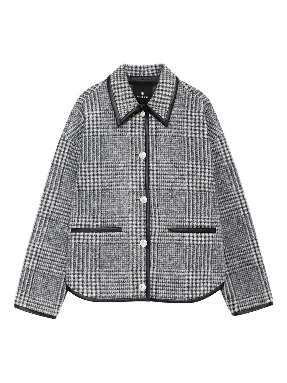 check-pattern jacket Highlights - Black - Check pattern - Faux leather trim - Button fastening - Welt pockets Imported Composition Polyester 68%, Wool 32% Washing instructions Read Manufacturer Guidelines