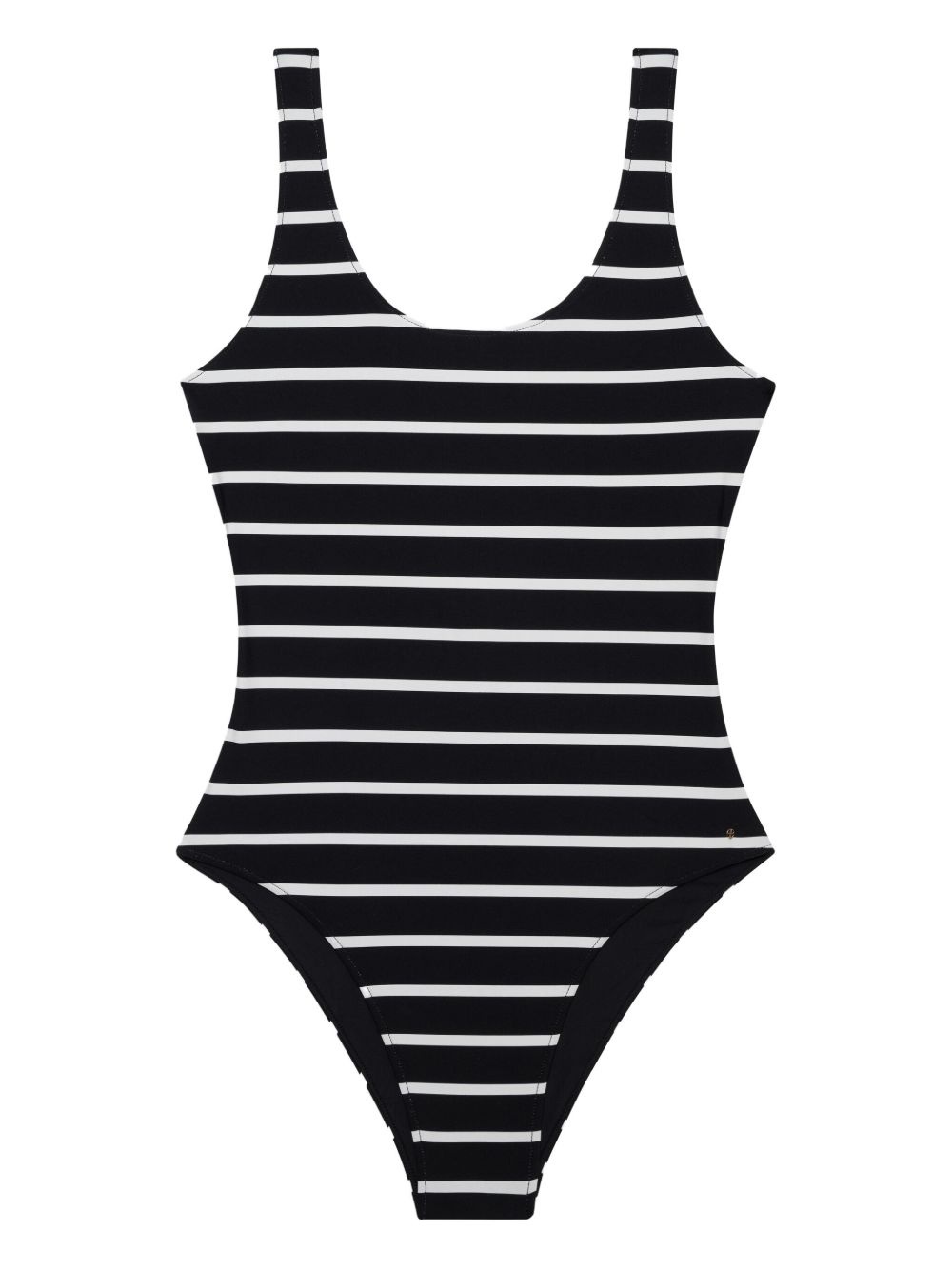 Jace swimsuit Highlights - Black - Scoop neck - Open back - Vertical stripe print - Be mindful to try on swimwear over your own garments. Imported Composition Recycled Nylon 85%, Spandex/Elastane 15%