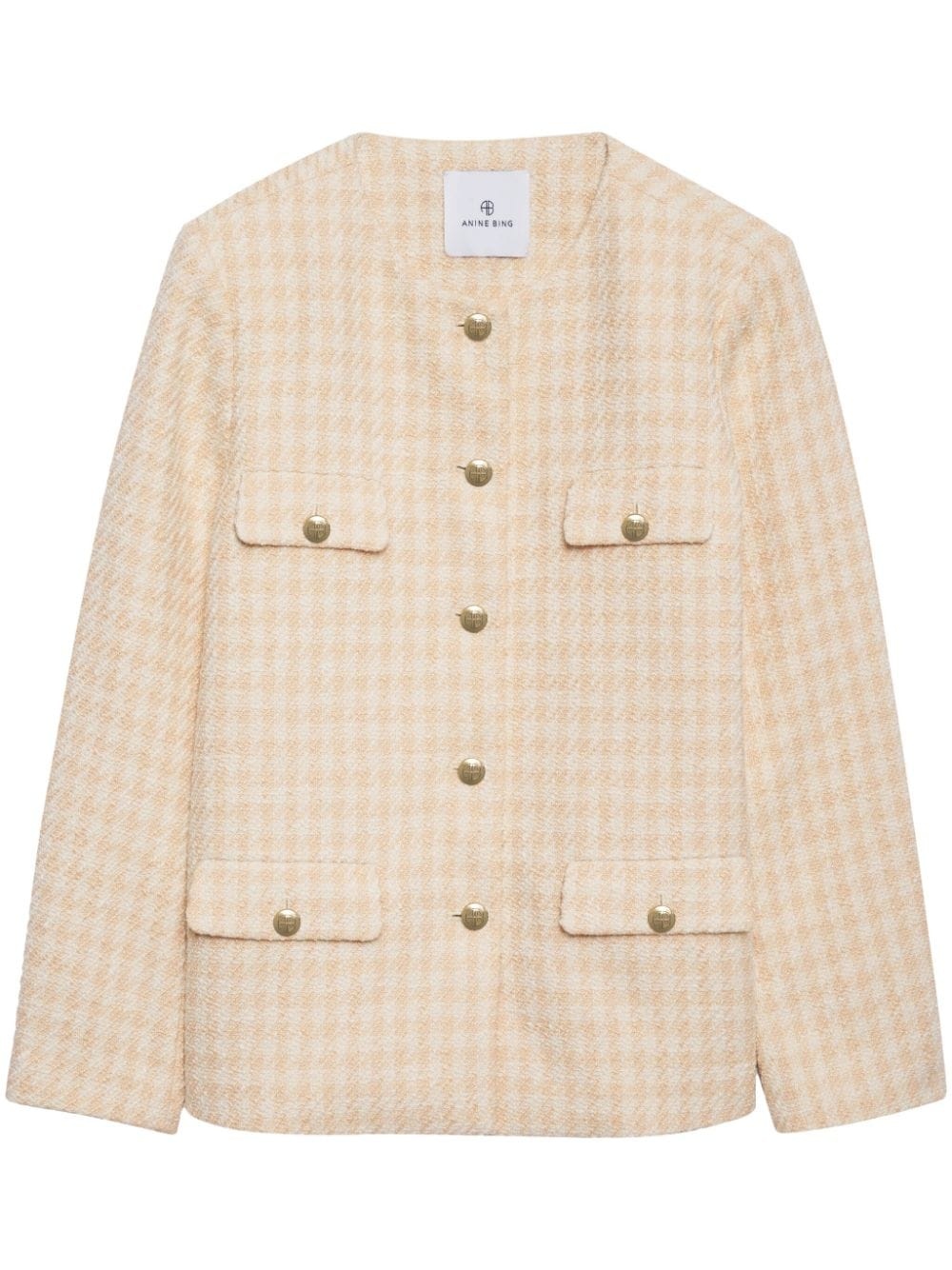 Janet houndstooth tweed jacket ANINE BING's focus on high-quality designs is shown on this Janet jacket. A modern take on a vintage-inspired silhouette, this model is crafted from a mix of wool and cotton in a cream and peach houndstooth pattern. Highlights - Cream white/peach pink - Wool-cotton blend - Houndstooth pattern - Round neck - Front button fastening - Two button-fastening chest pockets - Two side button-fastening pockets - Long sleeves - Straight hem Imported Composition Polyester 70%, Cotton 20%, Wool 10% Washing instructions Read Manufacturer Guidelines