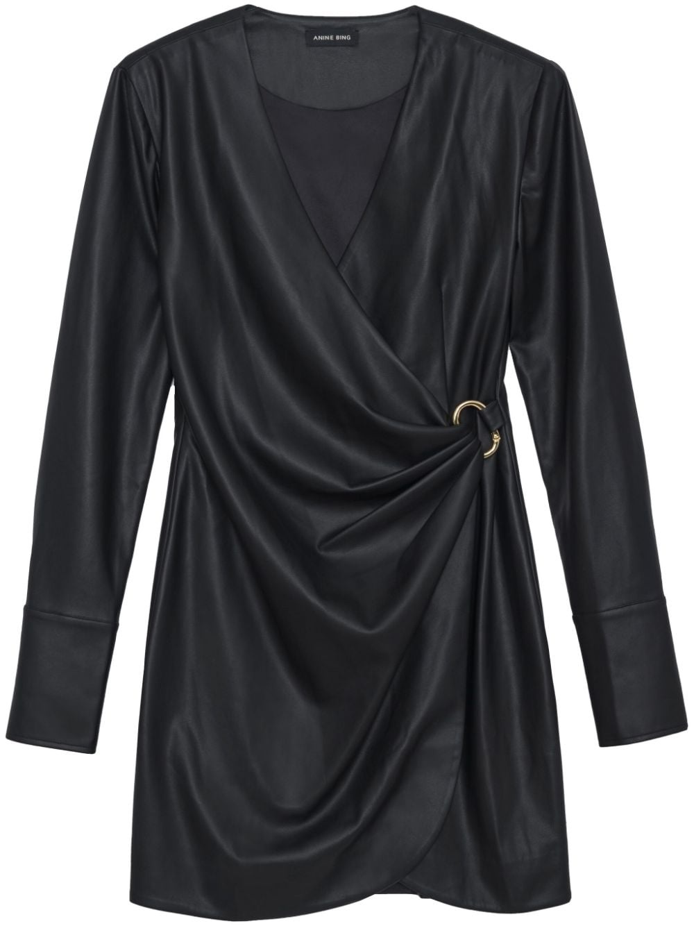 Joey faux-leather wrap minidress Highlights - Jet black - Faux leather - Wrap design - Draped design - D-ring buckle fastening - Gold-tone hardware - Plunging v-neck - Long sleeves - Buttoned cuffs - Asymmetric hem - Above-knee length Imported Composition Polyurethane 100% Washing instructions Hand Wash