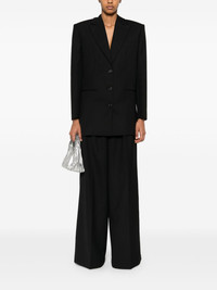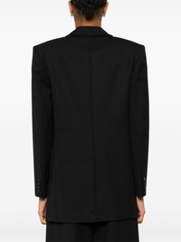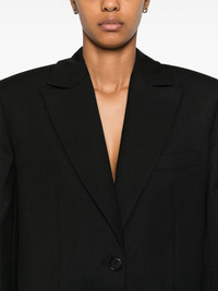 single-breasted blazer Highlights - Black - Front button fastening - Peak lapels - Chest welt pocket - Shoulder pads - Long sleeves - Buttoned cuffs - Two front jetted pockets - American rear vent - Full lining - Straight hem Imported Composition Outer: Polyester 52%, Wool 48% Lining: Polyester 55%, Viscose 45% SIZE & FIT Model measurements Height 5 ft 10 in(1.77 m) Bust/Chest 33.07 in(84 cm) Hips 37 in(94 cm) Waist 24.8 in(63 cm) FittingInformation Designed for a boxy fit, intended for a loose fit throughout The internal shoulder pads offer a structured shape Made from a midweight non-stretch fabric