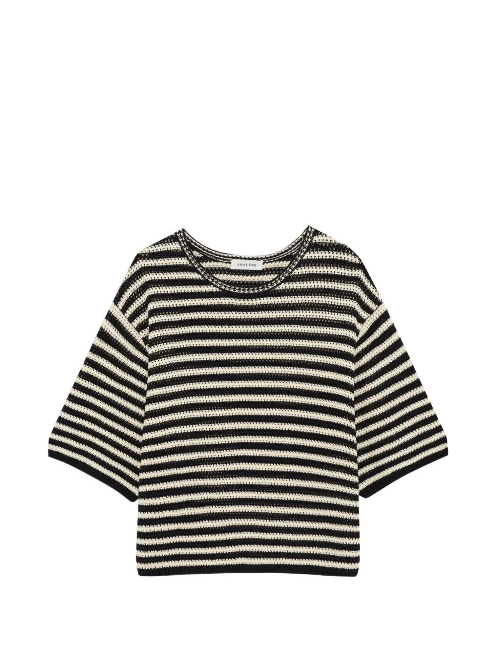 Theo striped sweater Highlights - Black and ivory - Striped - Round neck - Short sleeves - Knit construction Imported Composition Merino 90%, Cashmere 10% Washing instructions Hand Wash