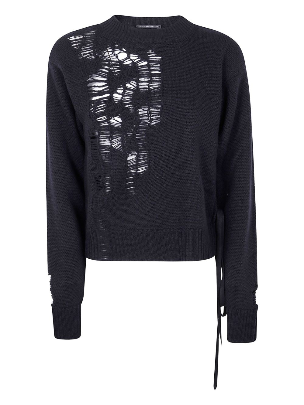 side-tie distressed wool sweater Highlights - Black - Wool - Distressed detail - Side tie - Round neck - Long sleeves Imported Composition Wool 100%