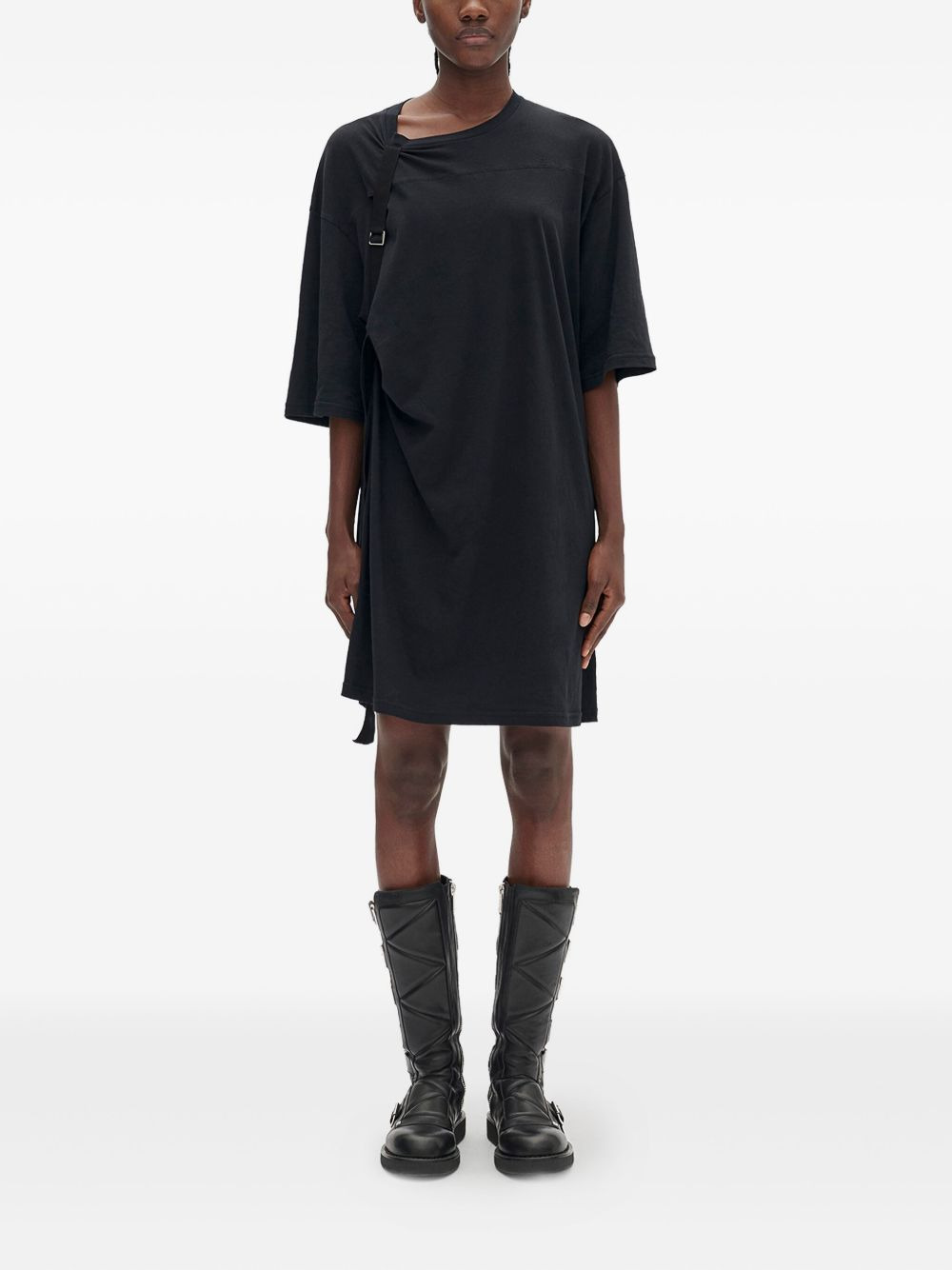 strap-detail brushed-jersey dress Highlights - Black - Brushed jersey - Strap detail - Asymmetrical neckline - Short sleeves - Gathered waist Imported Composition Cotton 100% Washing instructions Read Manufacturer Guidelines