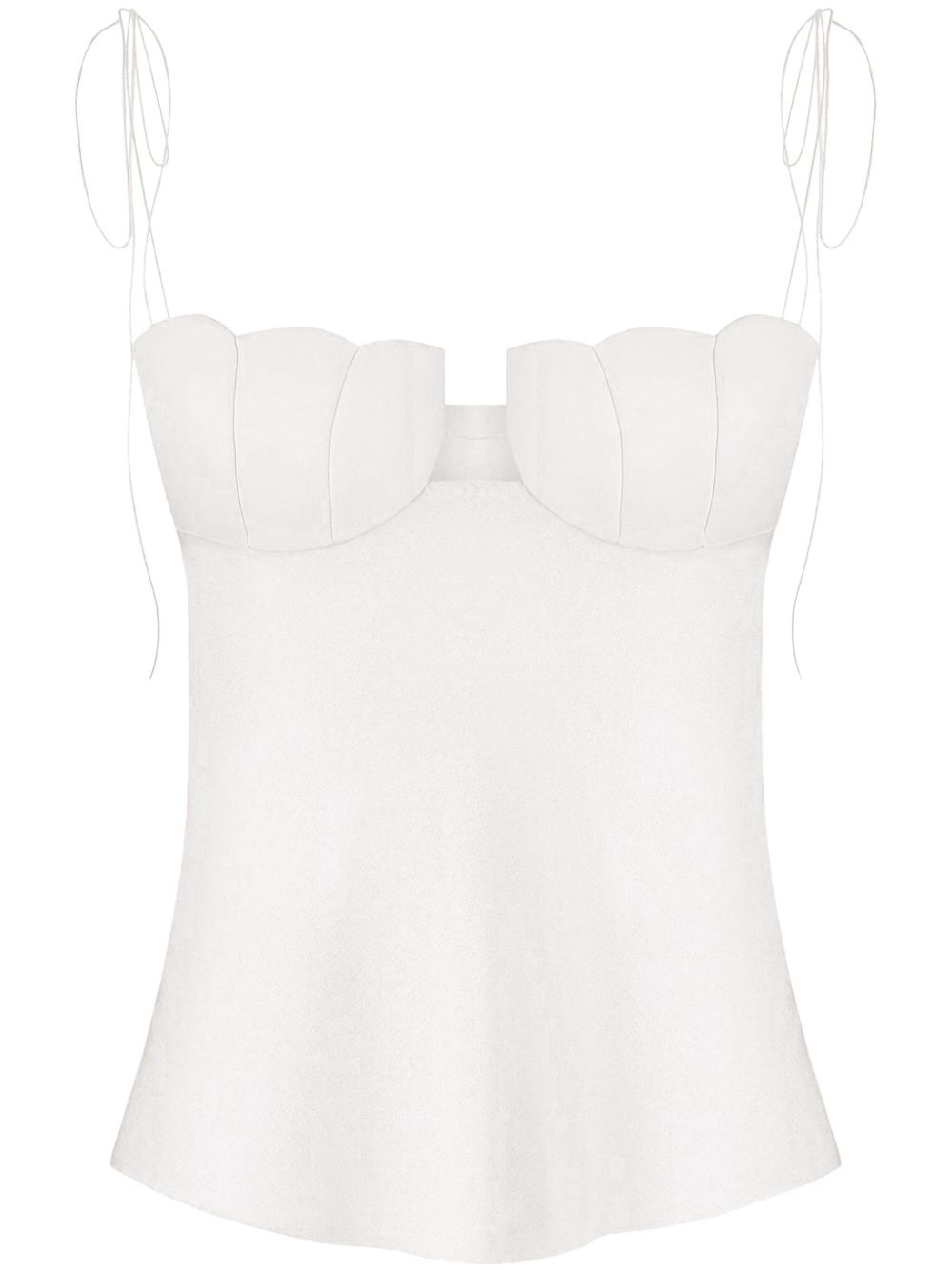 Iolantha top Highlights - Ivory white - Satin weave - Concealed side zip fastening - Tie-fastening straps - Square neck - Scallop edge - Cut-out detailing - Flared hem - Straight hem Imported Composition Acetate 78%, Viscose 22% SIZE & FIT FittingInformation Designed for a slim fit that sits just away from the body offering a close yet comfortable fit The moulded cups offer shape and support Made from a lightweight non-stretch fabric