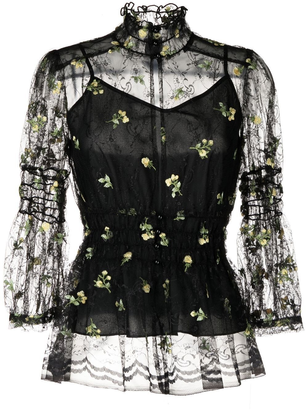 floral-embroidered lace blouse black sheer lace overlay partial lining all-over floral embroidery frilled high neck keyhole neck smocked waist peplum hem three-quarter length sleeves Made in United States Composition Polyester 100% SIZE & FIT Model measurements Height 5 ft 10 in(1.77 m) Bust/Chest 31.49 in(80 cm) Hips 35.43 in(90 cm) Waist 25.19 in(64 cm) Washing instructions Dry Clean Only