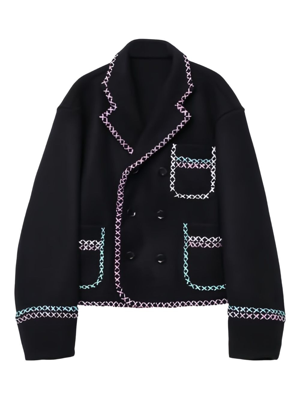 double-breasted embroidered short coat Highlights - Black - Double-breasted fastening - Three patch pockets - Embroidered seams - Cross-stitch detailing - Wool Imported Composition Wool 100% Washing instructions Read Manufacturer Guidelines