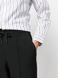 Alfreda drawstring trousers These black trousers speak to A.P.C.'s affinity for casual staples with a refined twist. They’re neatened with pressed creases and secured with an elasticated drawstring waistband. Highlights - Black - Pressed crease - Elasticated drawstring waistband - Two side slit pockets - Straight leg Imported Composition Recycled Polyester 61%, EcoVero Viscose (LENZING) 26%, Cotton 7%, Elastane 6% SIZE & FIT Model measurements Height 5 ft 9 in(1.76 m) Bust/Chest 33.07 in(84 cm) Hips 34.64 in(88 cm) Waist 25.59 in(65 cm) FittingInformation Designed with a wide-leg cut, these trousers allow for a close fit at the waist and offer a loose and roomy fit over the leg The elasticated waist allows for a comfortable fit Made from a midweight stretch fabric, this piece offers elasticity and flexibility when worn This piece fits true to size – take your usual size Washing instructions Dry Clean Only