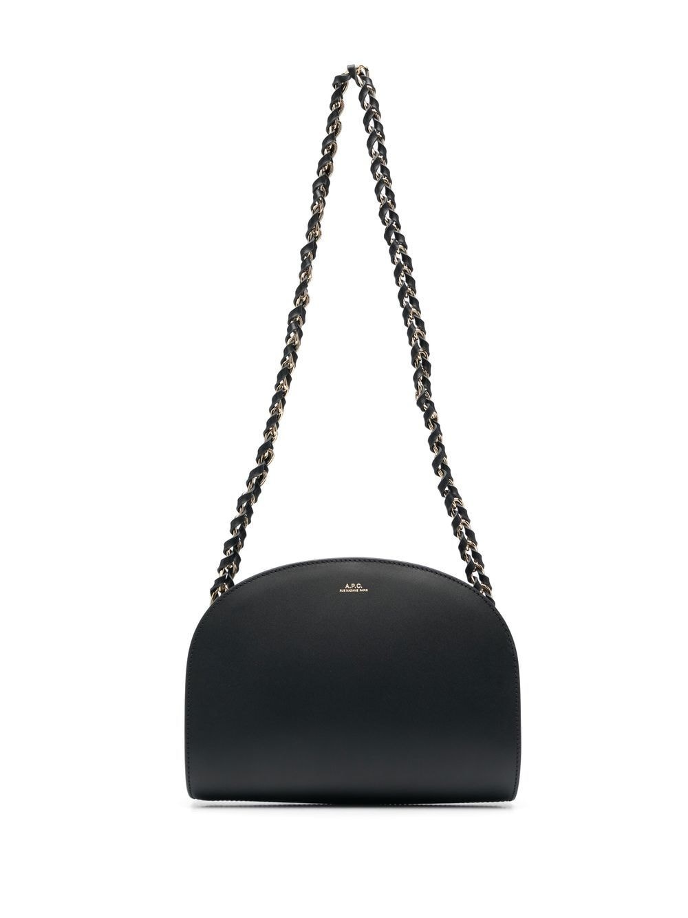 Demi Lune shoulder bag One of A.P.C.'s most emblematic styles, the Demi Lune shoulder bag is so-called thanks to its semi-circular design and moon resemblance. Keeping the signature shape, this iteration arrives in a black calf leather construction and carried by a chain shoulder strap. Imported Composition Lining: Cotton 100% Outer: Calf Leather 100% SIZE & FIT Model measurements Height 5 ft 10 in(1.78 m) Bust/Chest 31.49 in(80 cm) Hips 36.22 in(92 cm) Waist 25.59 in(65 cm) Measurement DEPTH 2.36 in(6 cm) HEIGHT 6.69 in(17 cm) STRAP 15.74 in(40 cm) WIDTH 9.44 in(24 cm)