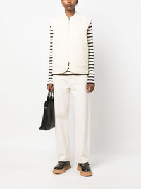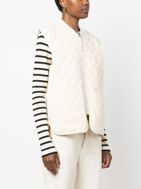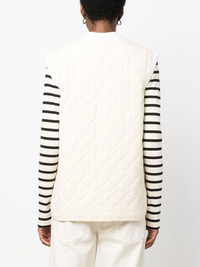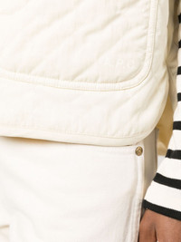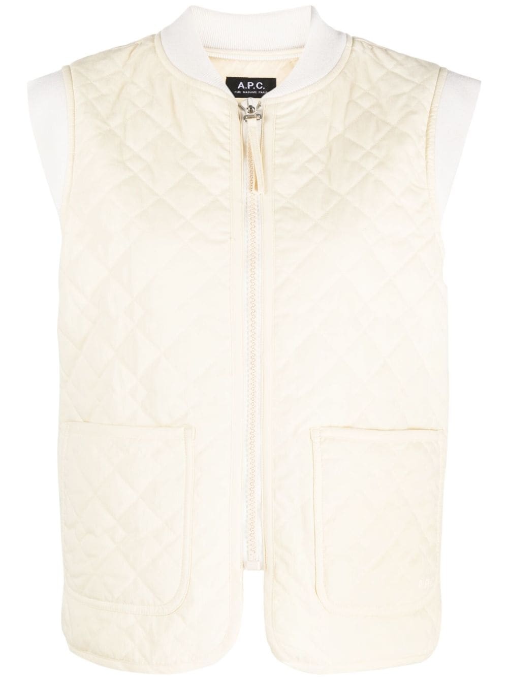 Elea quilted gilet A.P.C's Elea gilet demonstrates the brand's affinity for casual elegance. Crafted from a blend of cotton with water-repellent properties, the quilted construction is punctuated with a petite logo patch at the left pocket. Highlights - Vanilla white - Cotton blend - Water-repellent finish - Quilted - Ribbed band collar - Front zip fastening - Two front patch pockets - Logo print to the front - Sleeveless - Straight hem Imported Composition Outer: Cotton 75%, Acrylic 47%, Virgin Wool 47%, Polyamide 25%, Elastane 6% Lining: Polyester 100% SIZE & FIT Model measurements Height 5 ft 11 in(1.8 m) Bust/Chest 31.49 in(80 cm) Hips 36.61 in(93 cm) Waist 24.4 in(62 cm) FittingInformation Designed to be unstructured, offering a loose fit throughout Made from a quilted non-stretch fabric, giving it no natural elasticity