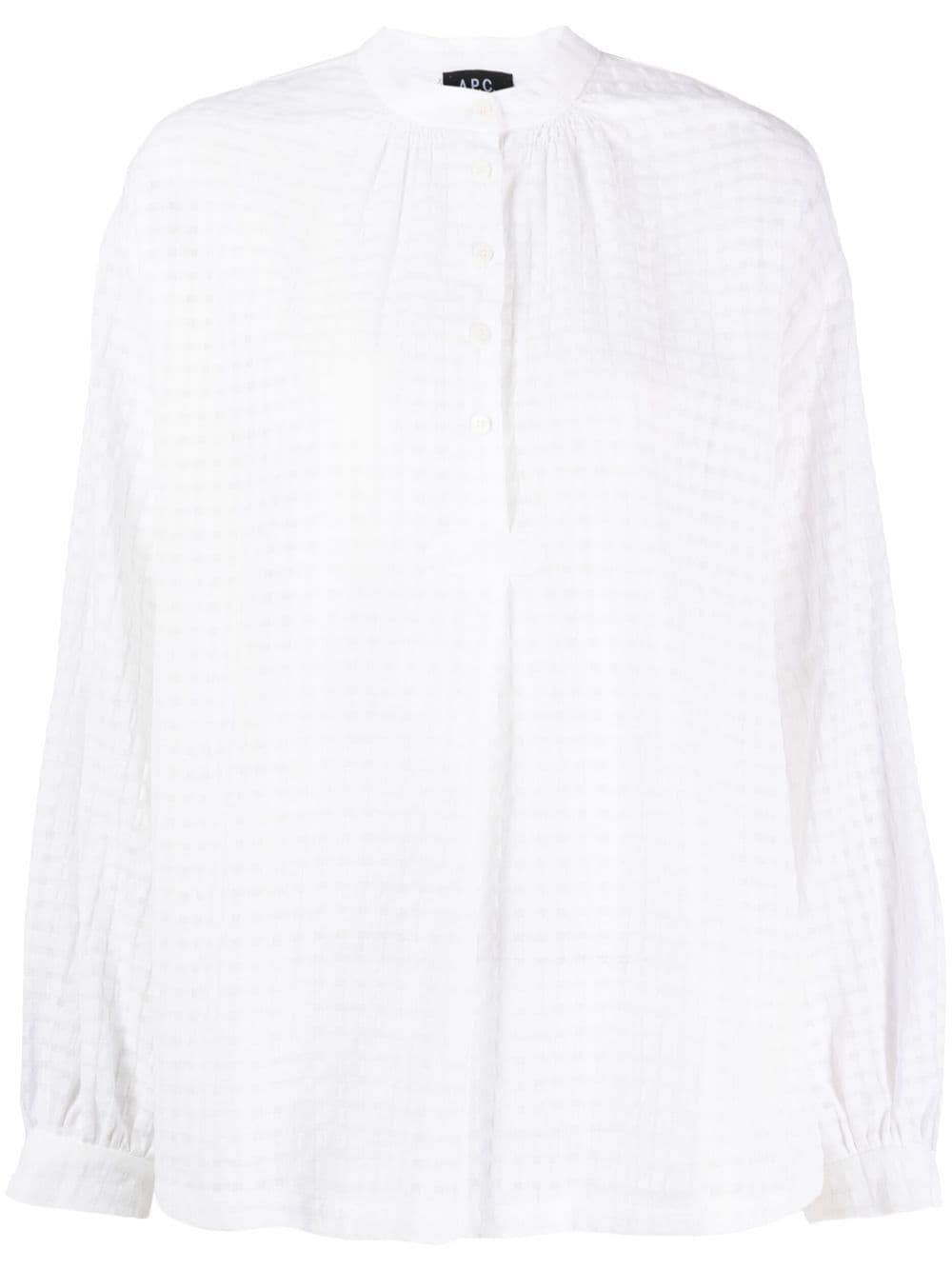 Flora tartan-check cotton blouse A.P.C. presents a subtle take on the traditional check pattern, as showcased by this Flora shirt. Crafted from crisp white cotton, it boasts an openwork tartan design throughout in a slightly contrasting hue. Imported Composition Cotton 100% SIZE & FIT Model measurements Height 5 ft 10 in(1.78 m) Bust/Chest 31.49 in(80 cm) Hips 36.22 in(92 cm) Waist 25.59 in(65 cm) Measurement CHEST 40.94 in(104 cm) HIPS 42.51 in(108 cm) LENGTH 26.77 in(68 cm) FittingInformation This piece fits true to size. We recommend you get your regular size Cut for a loose fit Made with a mid-weight non-stretch fabric Washing instructions Dry Clean Only