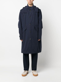 hooded parka coat In keeping with A.P.C.’s minimalist aesthetic, this navy parka is crafted from a breathable cotton blend to a relaxed silhouette. Highlights - Navy blue - Cotton blend - Funnel neck - Drawstring hood - Front press-stud fastening - Two side flap pockets Imported Composition Lining: Polyester 100% Outer: Cotton 75%, Polyamide 25% SIZE & FIT Model measurements Height 6 ft 1 in(1.86 m) Bust/Chest 36.61 in(93 cm) Hips 37 in(94 cm) Waist 28.74 in(73 cm) FittingInformation Designed to be unstructured, offering a loose fit throughout The internal drawstring at the hem allows for fitted preferences Made from a midweight non-stretch fabric This piece fits true to size – take your usual size Washing instructions Dry Clean Only