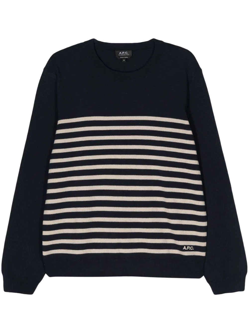 Matthew striped sweater A.P.C's nonchalant style is exhibited with this crew-neck sweatshirt. Crafted in a cashmere-cotton blend fabrication, the dark navy design is presented with contrasting white stripes. Highlights - Navy blue - Cotton-cashmere blend - Knitted construction - Horizontal stripe pattern - Crew neck - Long sleeves - Embroidered logo to the front - Ribbed cuffs and hem Imported Composition Cotton 50%, Cashmere 50% SIZE & FIT Measurement CHEST 44.09 in(112 cm) LENGTH 27.55 in(70 cm) SLEEVE LENGTH 25.98 in(66 cm) Shoulder Width 18.11 in(46 cm)