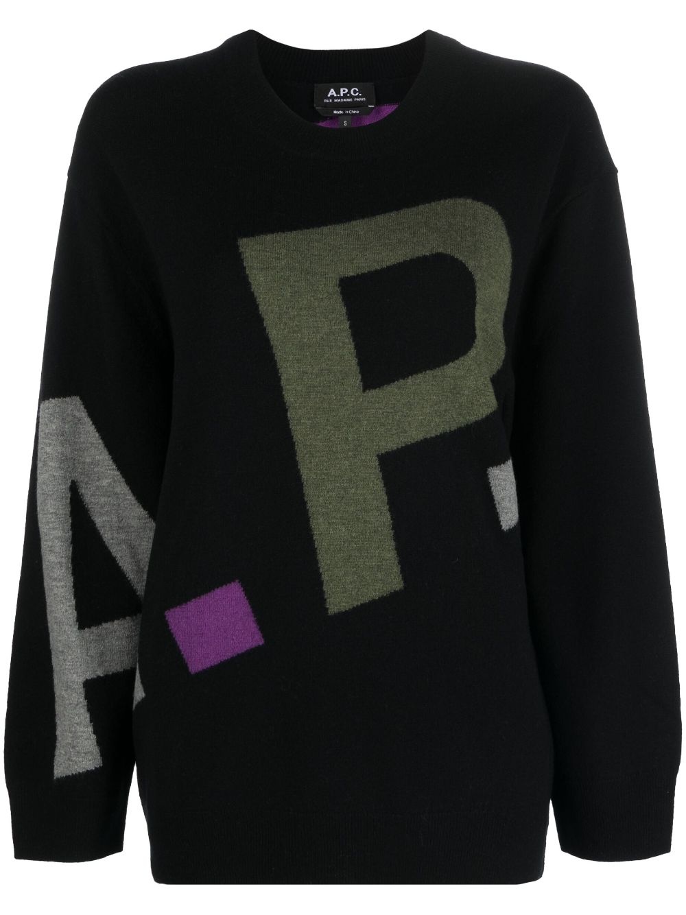 logo-print wool jumper A.P.C. contrasts a minimalist colour palette with loud graphic detailing in this virgin wool jumper. The brand's name is printed boldly across the piece in a unique diagonal layout. Highlights - Black - Virgin wool - All-over logo print - Crew neck - Drop shoulder - Long sleeves - Ribbed cuffs and hem Imported Composition Virgin Wool 100% SIZE & FIT Model measurements Height 5 ft 10 in(1.78 m) Bust/Chest 29.92 in(76 cm) Hips 34.64 in(88 cm) Waist 23.62 in(60 cm) FittingInformation Designed to be unstructured, offering a loose fit throughout Made with a midweight knit, this piece offers some stretch This piece fits true to size – take your usual size