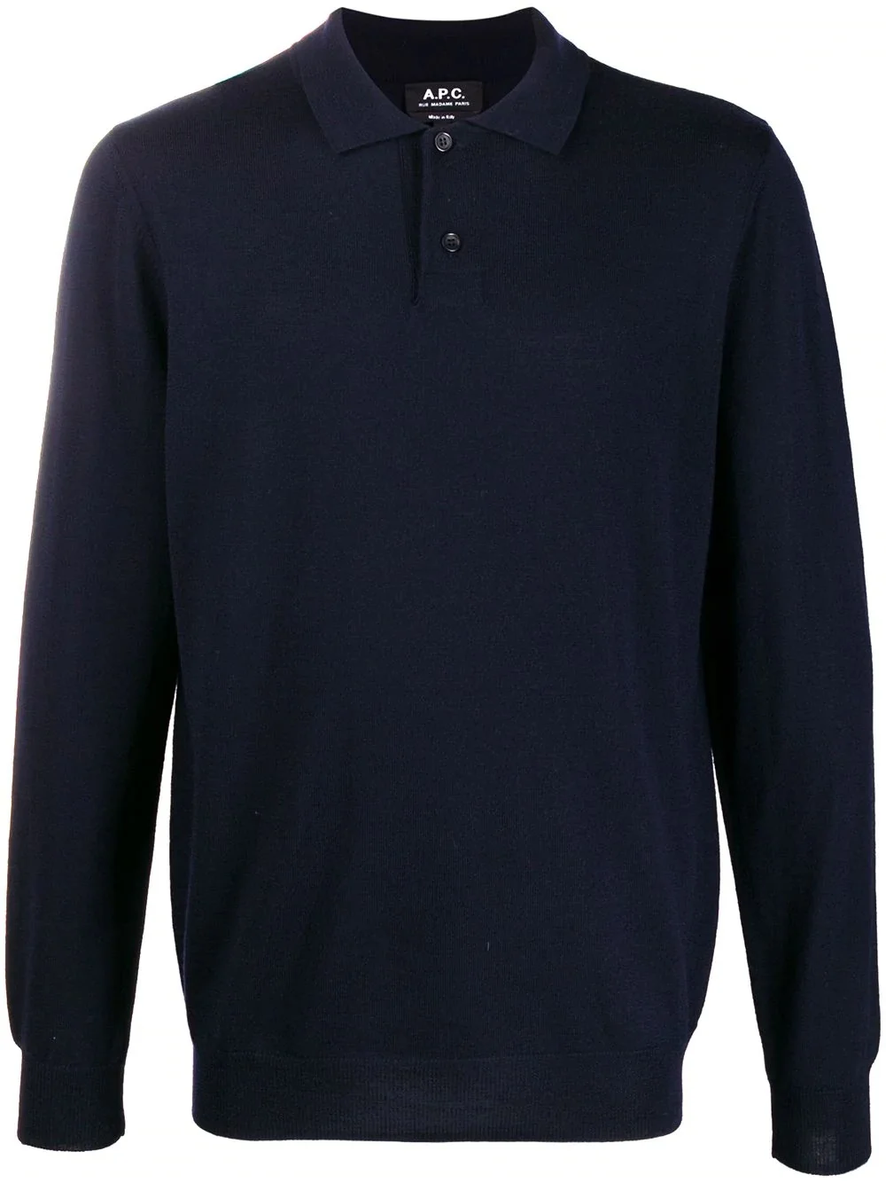 polo neck knitted sweater Navy merino wool polo neck sweater from A.P.C. featuring a cutaway collar, a front button fastening, long sleeves and a ribbed hem and cuffs. Made in Italy. Made in Italy Composition Merino 100% SIZE & FIT Model measurements Height 6 ft 2 in(1.87 m) Bust/Chest 38.18 in(97 cm) Hips 36.61 in(93 cm) Waist 29.13 in(74 cm) FittingInformation This piece fits true to size. We recommend you get your regular size Cut for a relaxed fit Made with a mid-weight fabric Washing instructions Hand Wash