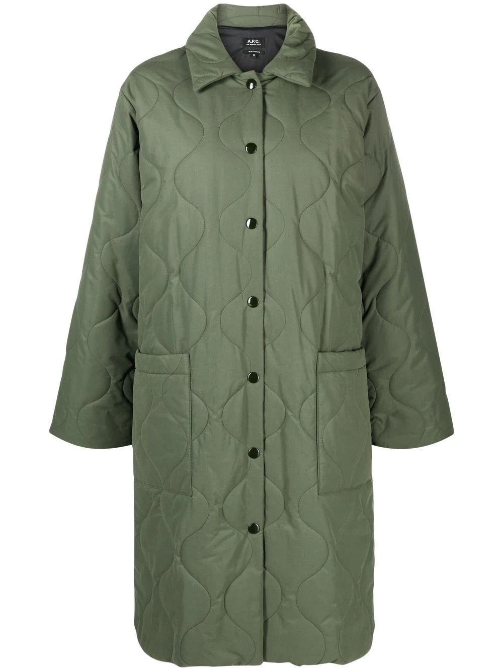 single-breasted quilted coat A.P.C is known for its minimalist aesthetic, as shown through this mid-length coat. Imagined in a khaki hue, this quilted design features a classic collar and two oversized patch pockets that reflect a utilitarian feel. Imported Composition Outer: Cotton 51%, Polyamide 49% Lining: Polyamide 100%, Polyester 100% SIZE & FIT Model measurements Height 5 ft 10 in(1.77 m) Bust/Chest 31.49 in(80 cm) Hips 33.85 in(86 cm) Waist 22.44 in(57 cm) Washing instructions Dry Clean Only