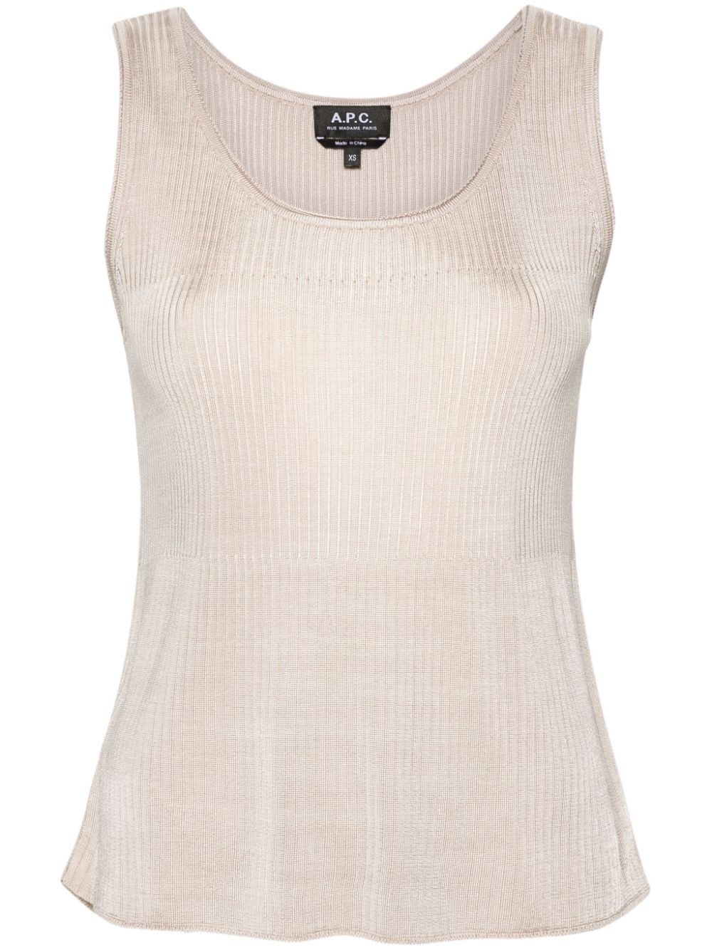 ribbed-knit top A.P.C proves its penchant for minimalist design with this tank top; it’s ribbed-knit from beige threads with a subtle lustrous shimmer. Highlights - Sand beige - Fine ribbed - Scoop neck - Sleeveless - Straight hem Imported Composition Viscose 100% SIZE & FIT Model measurements Height 5 ft 11 in(1.8 m) Bust/Chest 34.25 in(87 cm) Hips 35.82 in(91 cm) Waist 24.8 in(63 cm) FittingInformation Designed for a relaxed fit, this piece allows for comfort and movement when worn Made with a midweight knit, this piece offers some stretch This piece fits true to size – take your usual size Washing instructions Hand Wash