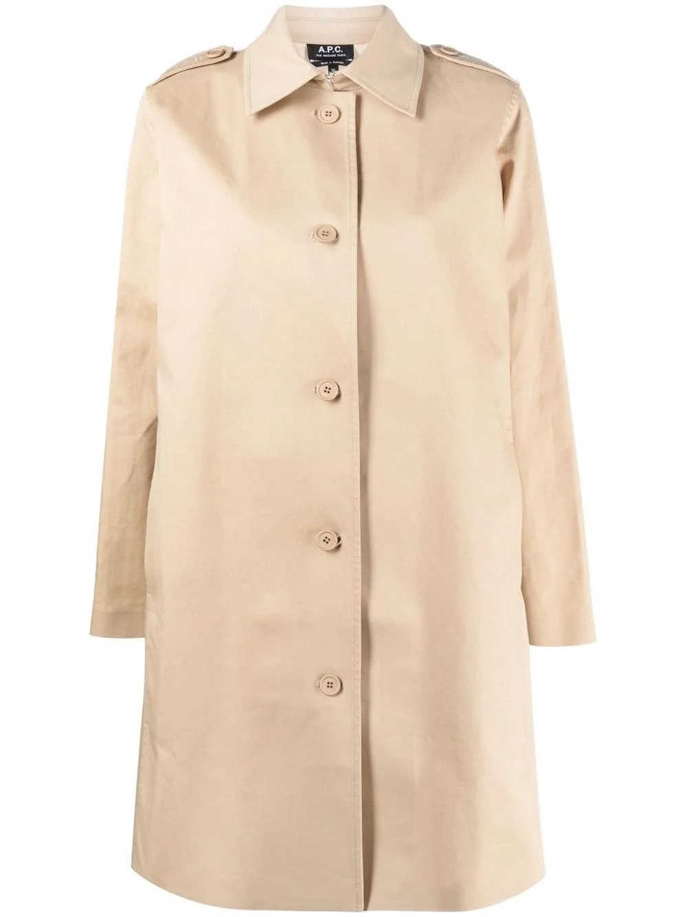 single-breasted midi coat Nodding to A.P.C.'s penchant for minimalistic design, this beige-hued midi coat arrives with a traditional buttoned-up design and single-breasted silhouette. Imported Composition Cotton 100% SIZE & FIT Model measurements Height 5 ft 10 in(1.78 m) Bust/Chest 33.07 in(84 cm) Hips 35.82 in(91 cm) Waist 25.98 in(66 cm) FittingInformation This piece fits true to size. We recommend you get your regular size Cut for a loose fit Made with a mid-weight non-stretch fabric Washing instructions Dry Clean Only