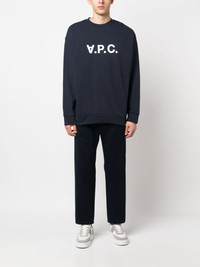V.P.C. logo-print organic-cotton T-shirt Crafted from organic cotton, this navy blue A.P.C. sweatshirt is soft and comfortable, framed with ribbed trim. A partially upturned logo print to the front adds a unique branded accent. Highlights - Navy blue - Organic cotton - Logo print to the front - Ribbed trim - Crew neck - Drop shoulder - Long sleeves - Straight hem Imported Composition Organic Cotton 100% SIZE & FIT Model measurements Height 6 ft 2 in(1.87 m) Bust/Chest 36.41 in(92.5 cm) Hips 35.43 in(90 cm) Waist 29.52 in(75 cm) Measurement LENGTH 26.37 in(67 cm) SLEEVE LENGTH 33.85 in(86 cm) Shoulder Width 22.83 in(58 cm) FittingInformation Designed for a relaxed fit, this piece allows for comfort and movement when worn The ribbed hem offers a close, comfortable fit Made from a midweight non-stretch fabric, this piece offers minimal elasticity when worn This piece fits true to size – take your usual size