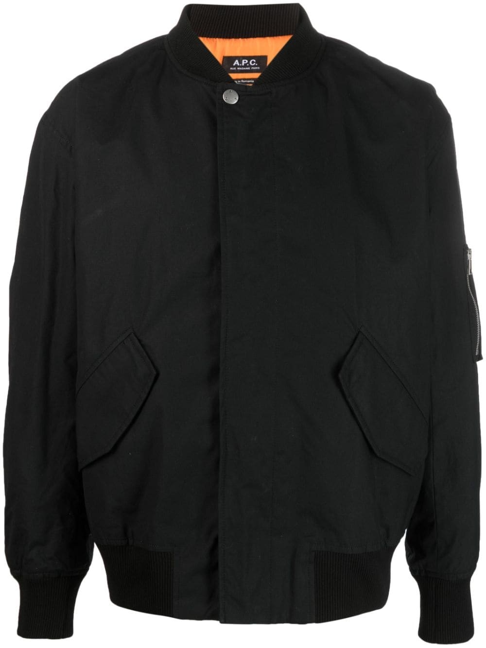 zip-pocket cotton bomber jacket Imagined in black, this bomber jacket by A.P.C. is crafted from cotton and cut to a relaxed fit. Featuring a concealed front fastening, it is accented by a zip pocket at the sleeve and ribbed edges framing de design. Highlights - Black - Cotton - Baseball collar - Concealed front fastening - Two side flap pockets - Long sleeves - Sleeve zip pocket - Ribbed edge - Straight hem Imported Composition Lining: Cotton 100%, Polyester 100% Outer: Cotton 100% SIZE & FIT Model measurements Height 6 ft 1 in(1.85 m) Bust/Chest 35.82 in(91 cm) Hips 37.79 in(96 cm) Waist 29.13 in(74 cm) FittingInformation Designed to be unstructured, offering a loose fit throughout The ribbed hem offers a close, comfortable fit Made from a midweight non-stretch fabric This piece fits true to size – take your usual size Washing instructions Dry Clean Only