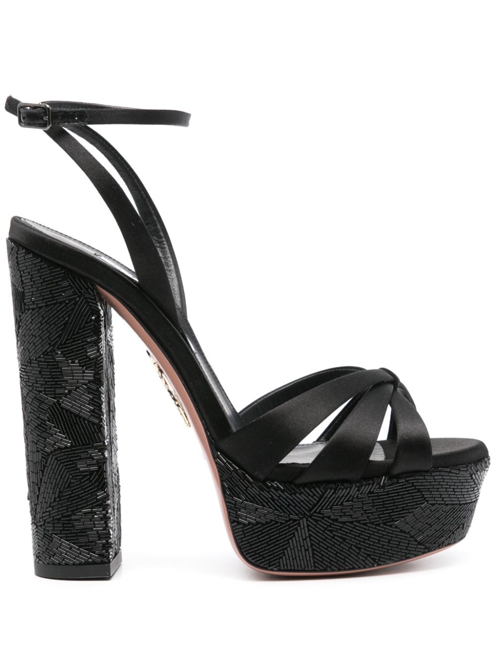 135mm bead-embellished sandals Highlights - Black - Satin weave - Bead embellishment at the heel - Buckle-fastening ankle strap - 135mmhigh block heel - Front strap detailing - Round open toe - Branded leather insole - 35mm platform sole - Leather outsole Made in Italy Composition PVC 100% SIZE & FIT Measurement HEEL 5.31 in(13.5 cm) PLATFORM 1.37 in(3.5 cm)
