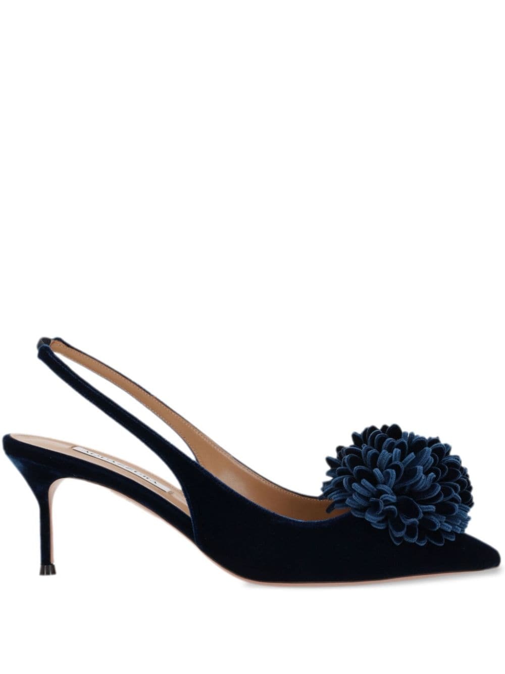 65mm Couturier slingback pumps Highlights - Blue - Leather - Velvet - Slip-on style - Elasticated slingback strap - 65mm stiletto heel - Floral applique - Pointed toe - Leather lining - Branded leather insole Made in Italy Composition Sole: Leather 100% Outer: Velvet 100% Lining: Leather 100% SIZE & FIT Measurement HEEL 2.55 in(6.5 cm)