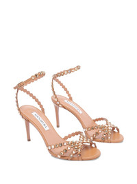 85mm leather heeled sandals Highlights - Caramel brown - Crystal-embellishment - Ankle strap - Stiletto heel - Open round toe - Branded insole Made in Italy Composition Lining: Calf Leather 100% Sole: Calf Leather 100% Outer: Calf Leather 100% SIZE & FIT Measurement HEEL 3.34 in(8.5 cm)