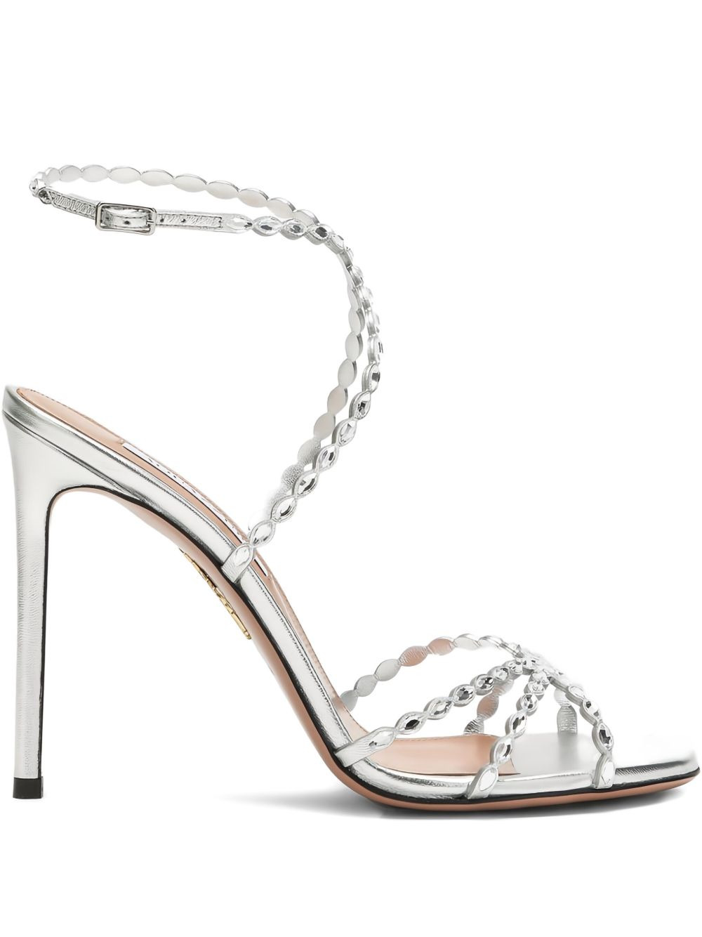 85mm Love Struck crystal-embellished sandals Highlights - Silver - Leather upper - Crystal embellishments - Stiletto heel - Ankle strap - Cross-over straps Made in Italy Composition Lining: Leather 100% Outer: Leather 100% Sole: Leather 100% SIZE & FIT Measurement HEEL 3.34 in(8.5 cm)