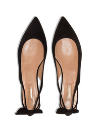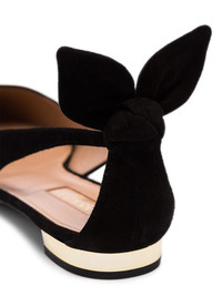 Bow Tie ballerina shoes Flats have perks too, you know. How would you catch your sister flat-footed if you were wearing heels? These Aquazzura ballerina shoes will allow you to catch her completely flat-footed while going through your things. Highlights - Black - Made from suede - Low metallic heels - Bow tie details at backs - Cut-outs at sides - Logo leather footbeds - Pointed toes crafted in italy Made in Italy Composition Sole: Calf Leather 100% Lining: Goat Skin 100% Outer: Kid Leather 100% SIZE & FIT Model measurements Height 5 ft 11 in(1.8 m) Bust/Chest 31.49 in(80 cm) Hips 35.43 in(90 cm) Waist 24.4 in(62 cm) FittingInformation This piece fits large – take one size down Measurement HEEL 0.59 in(1.5 cm) Washing instructions Specialist Cleaning
