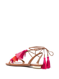 Capri tassel-detail sandals Aquazzura's Capri collection pays homage to the Italian island, its alluring landscape and 'Dolce Vita flair'. This flat iteration is crafted from brown leather and laced with slim ankle ties. They stand out due to the multicolour tassels and metallic-effect heels that add a glowing touch. Highlights - Brown/multicolour - Calf leather - Tassel detail - Round open toe - Thong strap - T-bar strap - Tie-fastening ankle strap - Flat sole - Branded leather insole Made in Italy Composition Lining: Calf Leather 100% Sole: Calf Leather 100% Outer: Fabric 100%, Calf Leather 100% SIZE & FIT Measurement HEEL 0.78 in(2 cm) WIDTH 9.64 in(24.5 cm)